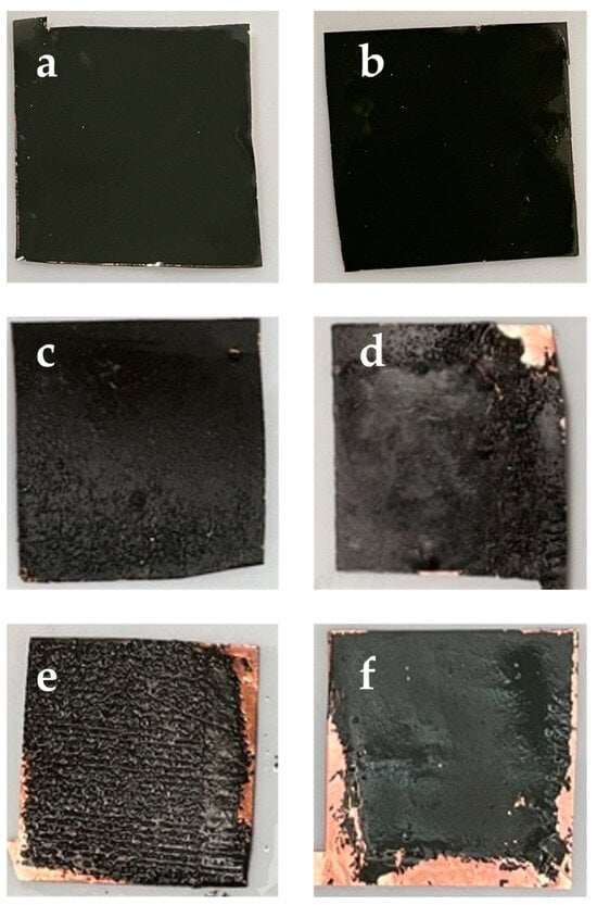 Photographs of silicon electrodes after cycling: (a) PAA; (b) LiOH-PAA(4.5); (c) PVDF + PAA; (d) f5 + PAA; (e) f20 + PAA; (f) f60 + PAA. Electrodes are 2.5 cm in size.