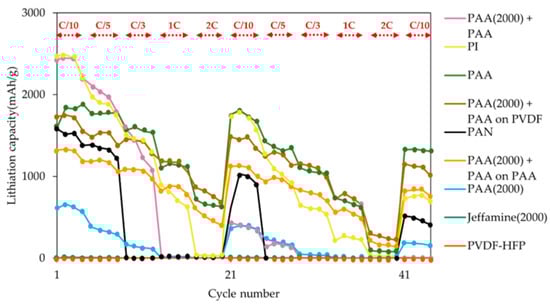 In Figure 12, the capacity of silicon anode half-cells is shown using the different samples listed in Table 3. PI demonstrates superior performance, maintaining the highest capacity. Notably, PVDF-HFP and short-chain polymer PAA(2000) and JeffamineTM D-2000 show significantly lower capacities compared with PI, which may be related to their poorer adhesion properties, leading to ineffective electronic transport between the current collector and the coating. In addition, PAN displays high initial capacities but undergoes a rapid decline as the C-rate increases. This decline could be attributed to its low molecular weight (70 kDa), which leads to poor adhesion to the current collector. It is also possible that due to the mechanical stiffness, PAN cannot accommodate the volume changes in the silicon during cycling.