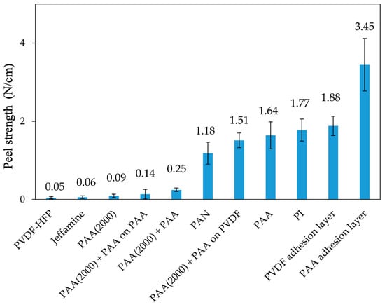 Average peel strength of electrode samples and two additional adhesion layer samples. Error bars indicate one standard deviation in the time-resolved sampling.