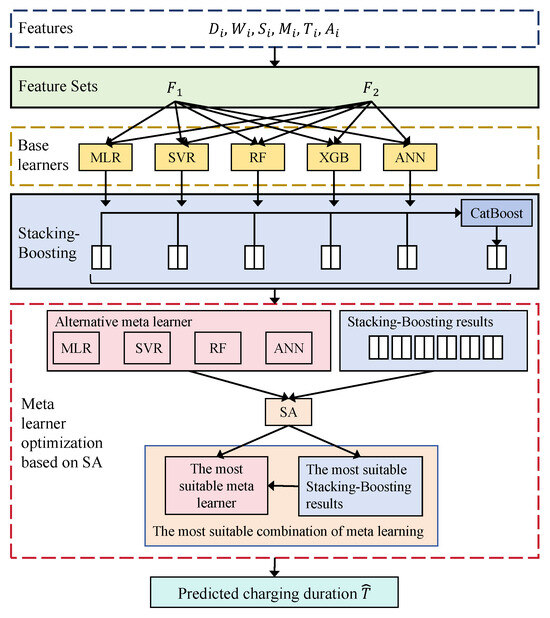 SA [36] is employed to optimize the combination of features and a meta-learner through heuristic optimization. By simulating the thermal motion of atoms in the annealing process of solid materials and probabilistically accepting inferior solutions to escape local optima, the algorithm seeks to find the global optimum. It eliminates poorly performing models and determines the optimal meta-learner from among MLR, SVR, RF, and the ANN. Subsequently, the outcomes from the chosen stacking–boosting approach serve as feature inputs to this optimal meta-learner. The ultimate forecasted charging duration is represented as .