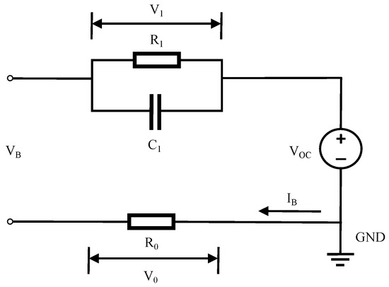 A first-order RC equivalent circuit model is adopted to describe the dynamics of LiBs, as shown in Figure 4. The model parameters reflect various electrochemical processes of the battery. The series resistance represents the battery’s ohmic resistance, used to simulate energy loss. The resistor and capacitor represent polarization dynamics, with as the capacitor voltage. denotes the open-circuit voltage, reflecting energy storage, while is the terminal voltage.