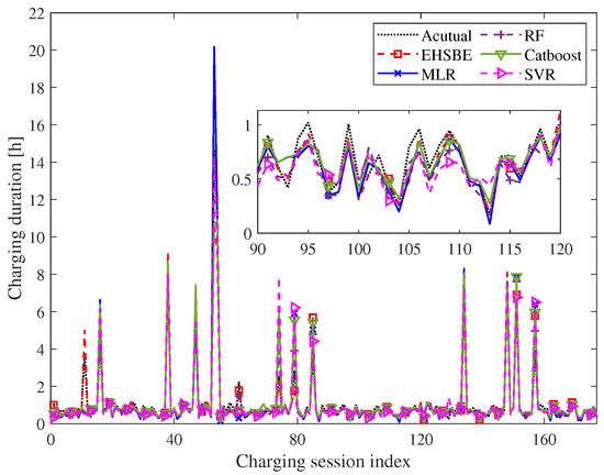 The EHSBE model employs five-fold cross-validation to segment the training of charging duration. To evaluate the prediction performance, multiple assessment metrics are selected in this study, including root mean square error (RMSE), mean absolute error (MAE), mean absolute percentage error (MAPE), and symmetric mean absolute percentage error (SMAPE). Additionally, to ensure a comprehensive evaluation, a certain EHSBE model with fixed random seed was systematically compared with several common prediction algorithms, such as RF, CatBoost, MLR, etc., as detailed in Table 2 and Figure 7. To validate the EHSBE method, we compared our results with those of other published methods. In [21], which used charging data from the Japan Automobile Research Institute, the method achieved an MAE of 12.38 min and an RMSE of 31.3 min for normal private charging scenarios. In contrast, our method achieved an MAE of 11.4 min and an RMSE of 23.1 min. In [20], which used data from the Adaptive Charging Network, the method had an MAE of 66.5 min. Given the differences in data volume and source, the method’s MAE was 66.5 min, whereas ours was reduced by 82.9%.