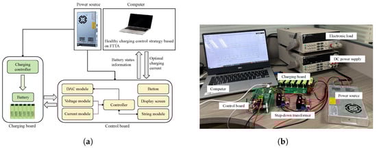 Experiments were conducted on Panasonic NCR18650GA LiFePO4 batteries (3.35 Ah, 3.7 V nominal voltage) to validate the proposed healthy charging strategy. The strategy was implemented on a computer equipped with a 3.6 GHz Intel i5-1035G1CPU, using MATLAB 2022b/Simulink to build a first-order RC model of the LiB. The manufacturer of the CPU is Intel Corporation. The company is headquartered in Santa Clara, California, United States. The framework of the hardware experimental platform is depicted in Figure 8a, and the construction of the charging experimental testing platform is shown in Figure 8b. The charging controller used was BQ24610, and the control module was STM32F103C8T6.