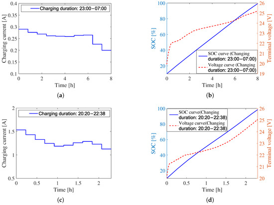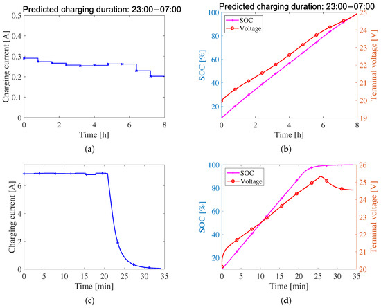 According to the charging prediction results in Figure 7, a charging case with a predicted charging duration of 23:00–07:00 was introduced. Compared with the fast charging method, the simulation results depicted in Figure 9 indicate that the healthy charging control strategy could raise the to approximately 100% within the predicted duration of 8 h, meeting user demand while avoiding high charging current and voltage and ensuring that the terminal voltage met safety-related constraints. In contrast, fast charging strategy reached nearly 100% in just 35 min but used high charging current and voltage.