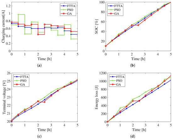 As shown in Table 4, the FTTA, along with PSO and the GA, satisfied the user’s electricity demand. However, FTTA reduced energy loss by 5.98% and 9.59% compared to PSO and the GA, respectively. This means that the FTTA could reach final values while generating less heat, better preserving battery health.