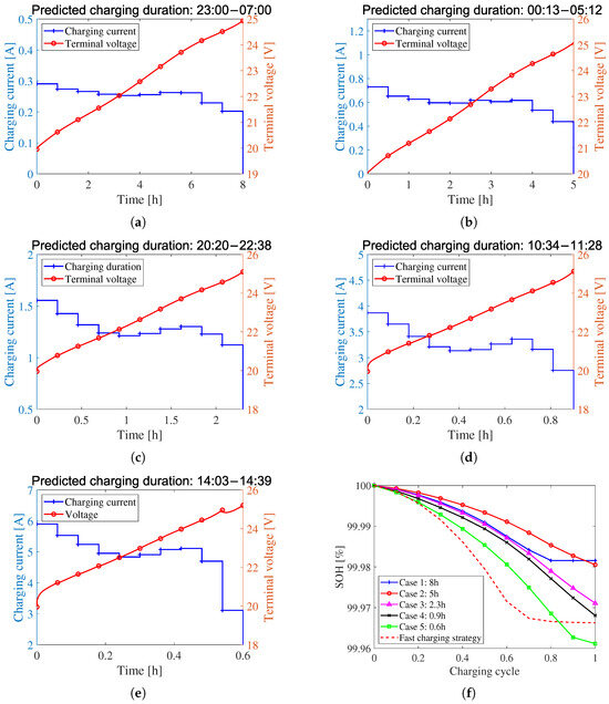 Charging current and terminal voltage curves for (a) case 1, (b) case 2, (c) case 3, (d) case 4, (e) and case 5 and (f) the change of one charging circle completed under different charging cases and strategies.