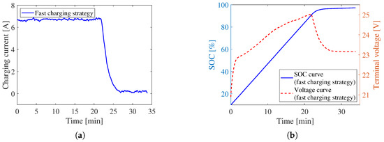 Experimental results based on fast charging strategy for batteries: (a) current, (b) , and voltage.
