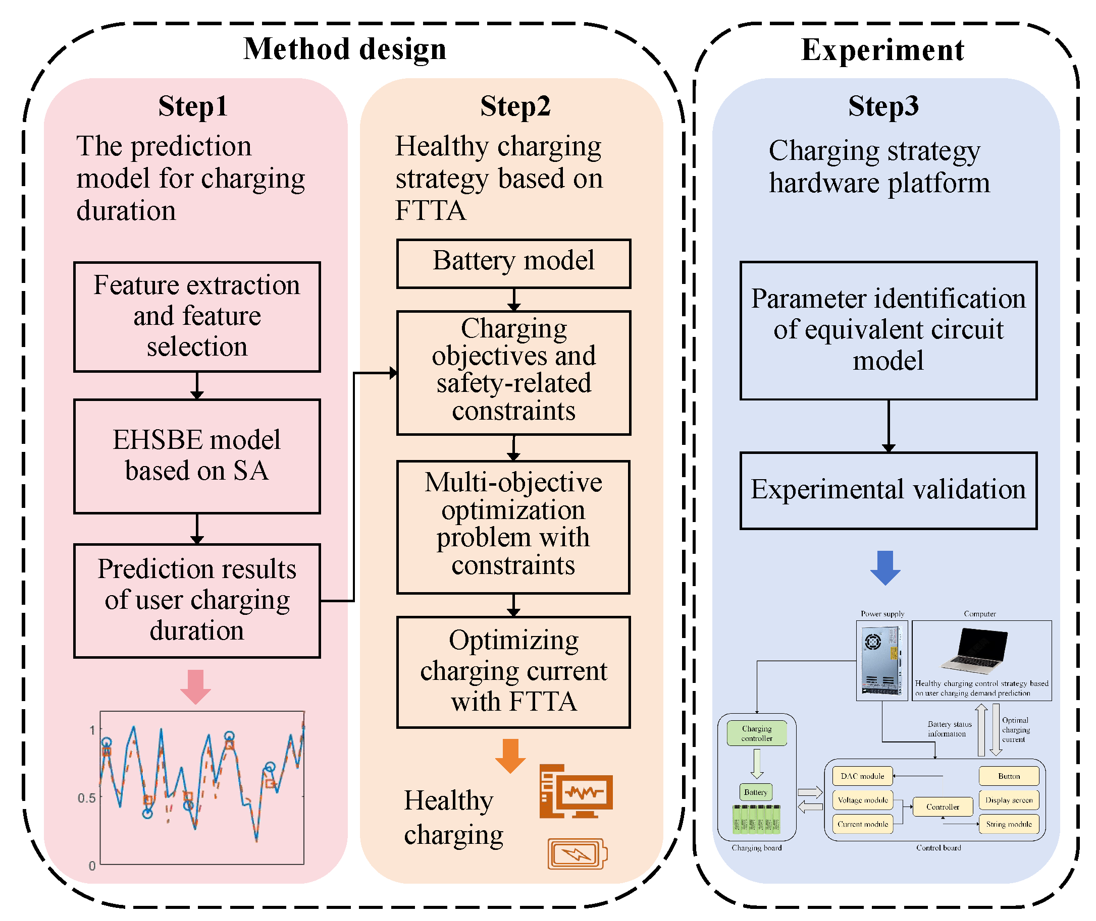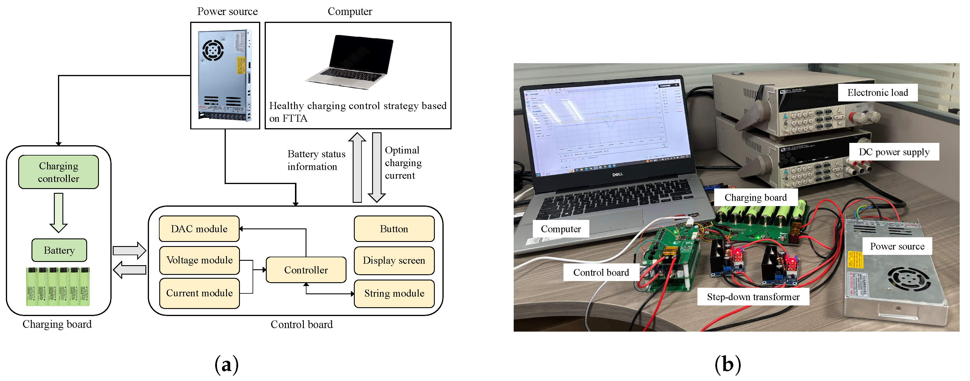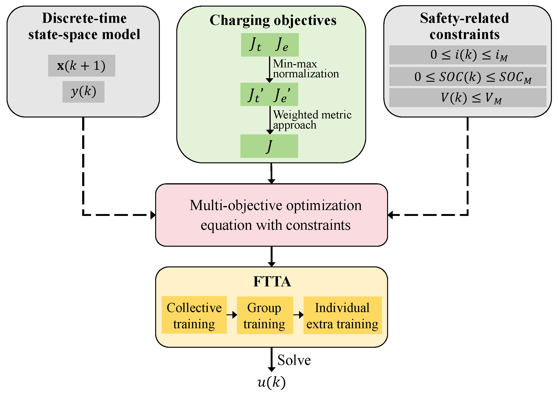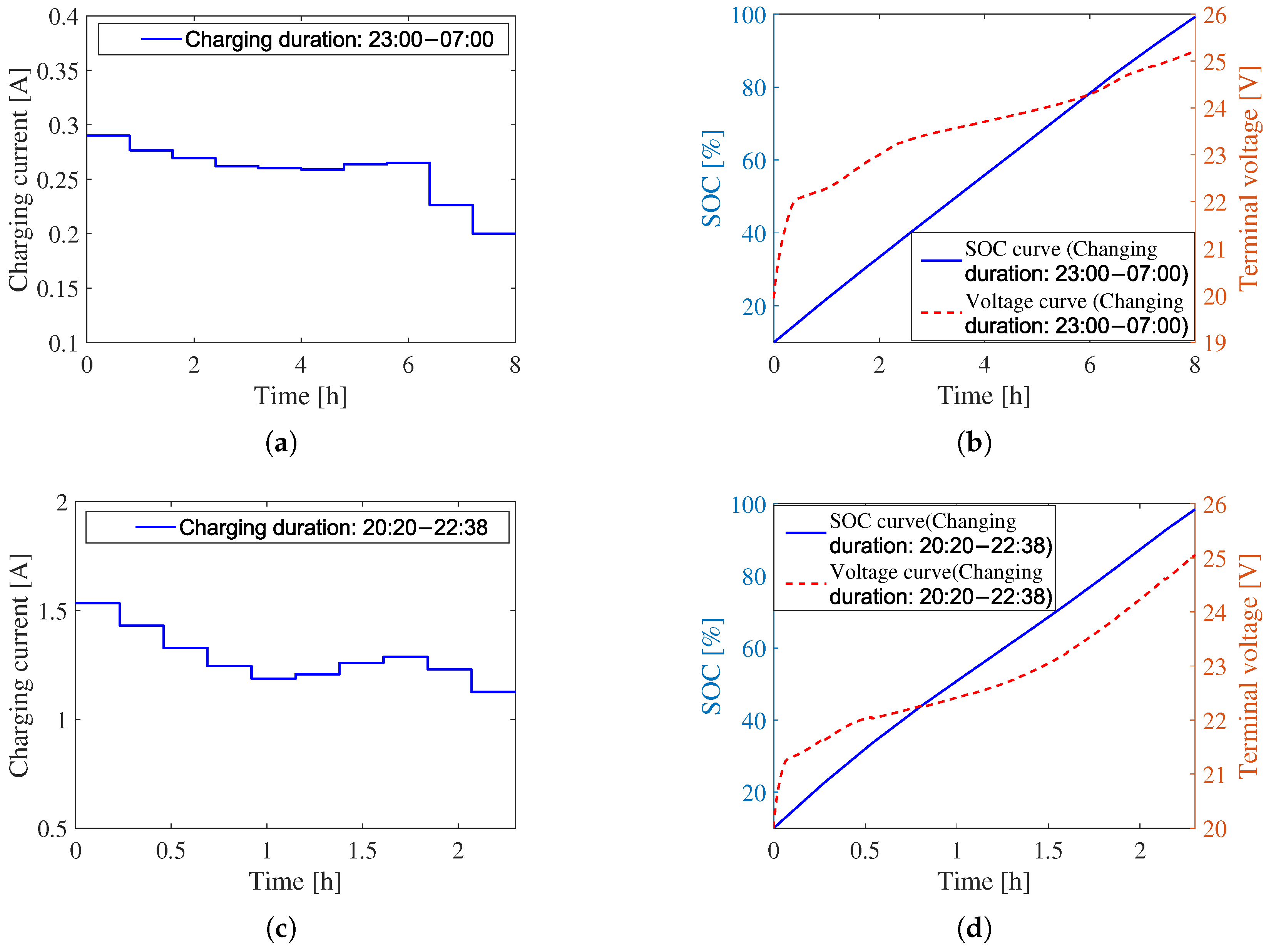 - Distinguished from the existing majority of studies, a user-demand-oriented healthy charging control strategy is developed. Considering users’ charging durations, the strategy employs the FTTA to solve for the optimal charging current through multi-objective equations with constraints. The FTTA intelligently adjusts the charging current based on user demand to complete the charging task. Moreover, this strategy prevents overcharging, reduces heat generation, extends battery life, and avoids low user satisfaction.