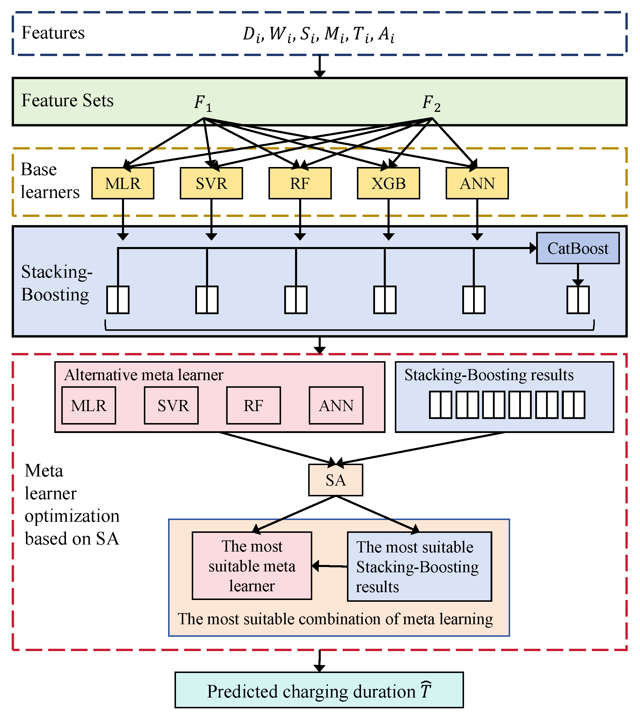- An EHSBE model is proposed to accurately predict the user’s charging duration. This hybrid framework not only enhances the accuracy of individual models through a boosting module but also maximizes model diversity by integrating a stacking module. As a result, it delivers highly reliable and robust predictions, effectively handling diverse charging demands.