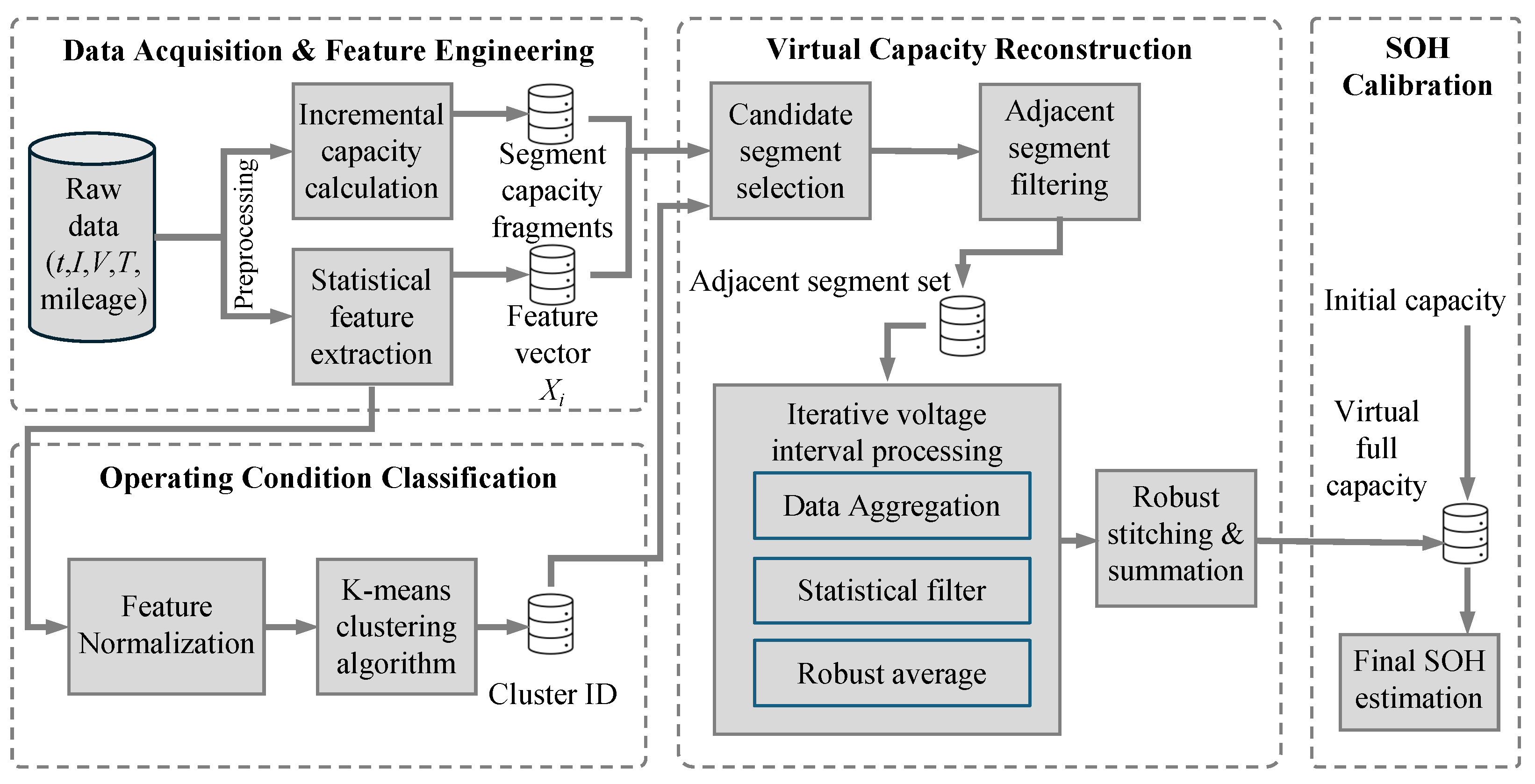 - Consistency of polarization via clustering: Ideally, the capacity integration intervals should be defined based on the open-circuit voltage (OCV) to reflect thermodynamic equilibrium. However, real-world BMS data typically provides only terminal voltage (), which differs from OCV due to ohmic potential drop and polarization effects:Direct usage of for data splicing across heterogeneous operating conditions would introduce significant systematic errors, as the voltage drop would vary drastically. To validate the use of , we employ a strict clustering strategy based on the dominant operating factors, including current and temperature. By ensuring that all segments within a specific cluster share statistically similar current and temperature profiles, we impose a constraint where the polarization terms remain consistent across spliced segments:Under this condition, aligning segments based on becomes mathematically equivalent to aligning them based on with a constant offset . This effective alignment preserves the physical validity of the capacity integration within the standardized voltage intervals, despite the lack of OCV measurements. While internal resistance increases with long-term aging, the proposed method reconstructs capacity profiles locally within a narrow mileage window. Consequently, the impedance and polarization characteristics are considered distinct for each reconstruction instance but consistent within the splicing set, thereby isolating the aging effect from the reconstruction process.