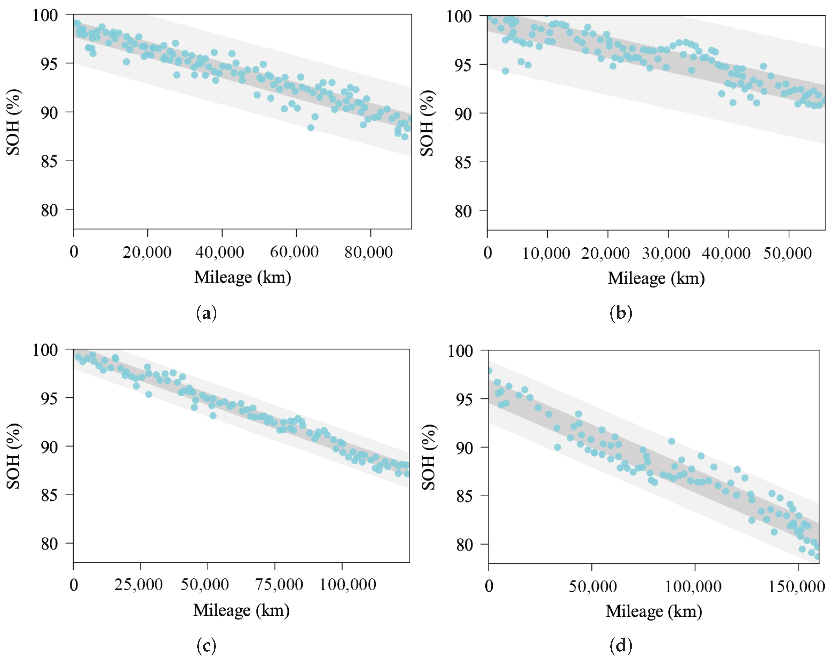 - Quasi-static degradation: Within a sufficiently small mileage window , the lithiumion battery’s capacity degradation is considered negligible. For any two mileages and within this window,