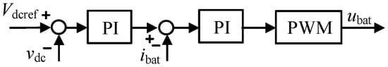 Figure 1 illustrates the architecture of the BES GFM system. It consists of the BES unit and the GFM inverter. The BES subsystem provides active power balancing and dynamic support to the DC-link. It consists of a battery stack providing the voltage vbat and current ibat, via a bidirectional DC–DC converter. The bidirectional converter allows the battery to either charge or discharge, depending on the control command and system operating conditions, enabling energy exchange with the DC-link to stabilize voltage vdc. As shown in Figure 2, the BES dual-loop controller consists of an outer DC-link voltage regulation loop and an inner battery-current tracking loop. The voltage loop monitors the deviation between the DC-link voltage vdc and its reference Vdcref, and a PI regulator generates the desired charging/discharging current. This current reference is subsequently fed into the inner loop, where a second PI controller ensures accurate control of the battery current ibat. The output of the inner PI regulator drives the PWM modulator to produce the switching commands for the power converter. By separating voltage regulation and current dynamics, the cascaded structure achieves robust disturbance rejection, improved transient performance, and enhanced protection against over-current and over-voltage events.