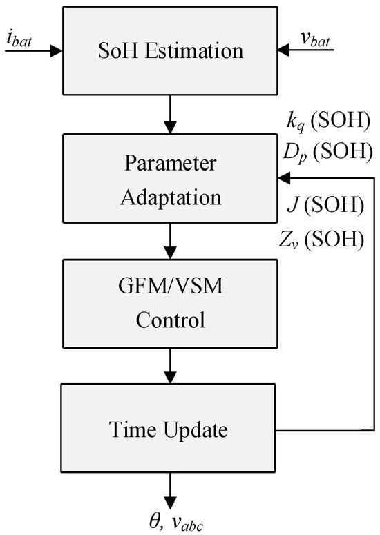 Existing GFM control strategies mainly focus on enhancing transient stability, improving weak-grid adaptability, or regulating power sharing among multiple units [11,12]. Typical approaches rely on tuning virtual inertia/damping, droop coefficients, or virtual impedance loops to achieve desired voltage and frequency behavior [3,4,13]. Although these methods can significantly improve dynamic performance, they generally neglect the degradation characteristics of the battery [14,15]. As a result, GFM converters may request transient power surges that exceed the battery’s aging-friendly operating region, thereby accelerating capacity fade and increasing internal resistance [8,9]. This issue becomes more pronounced in long-term deployment scenarios, where the State-of-Health (SoH) evolves with cycling, temperature, and operational stress [16,17]. A mismatch between control-level demands and the battery’s available capability can lead to inefficient operation, sub-optimal lifetime utilization, and potential safety risks [18].