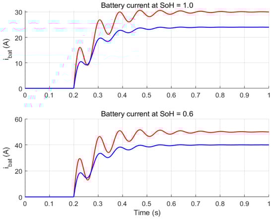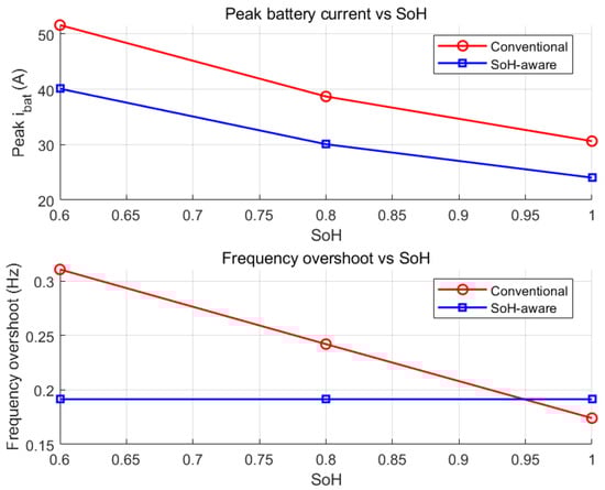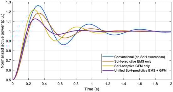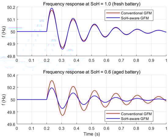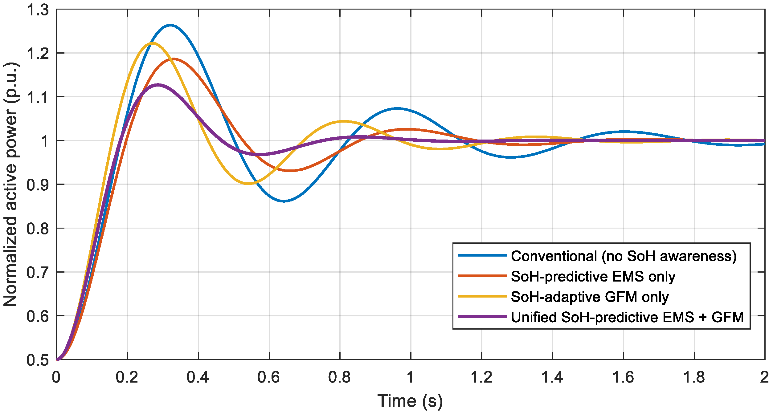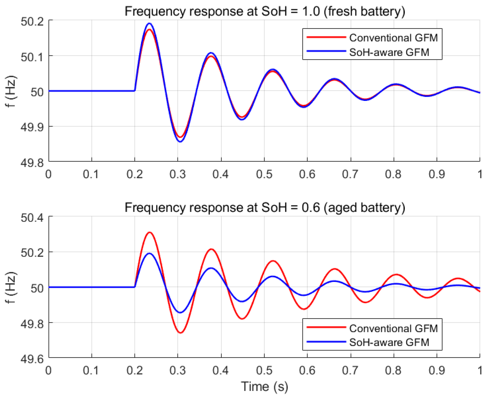 - Performance breakthrough under aging conditions: The proposed framework resolves the long-standing contradiction between battery aging and dynamic stability in grid-forming operation. Simulation results demonstrate that, compared with conventional non-SoH-aware control, the method reduces transient overshoot by up to 32%, shortens settling time by 25–40%, and lowers peak battery current stress by 12–23% under aged battery conditions, while maintaining consistent damping performance across different SoH levels.