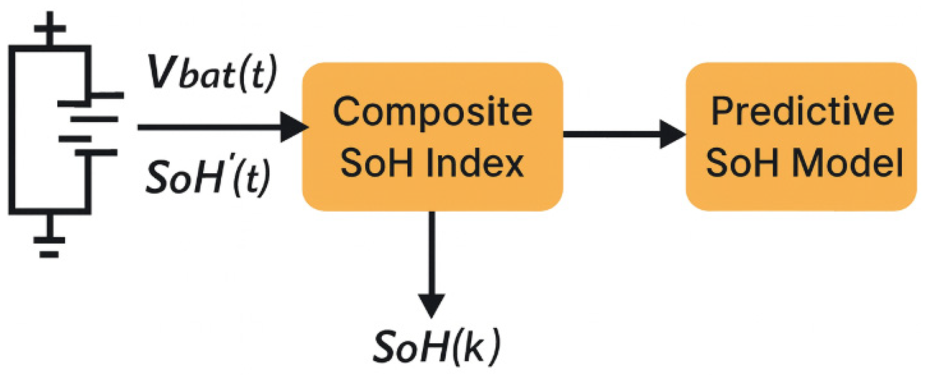Based on the above assumptions, the battery state-of-health is represented by a normalized scalar variable SoH in ([0, 1]), where SoH = 1 corresponds to the fresh state and SoH = 0 denotes the end-of-life condition. The discrete-time SoH evolution is modeled as