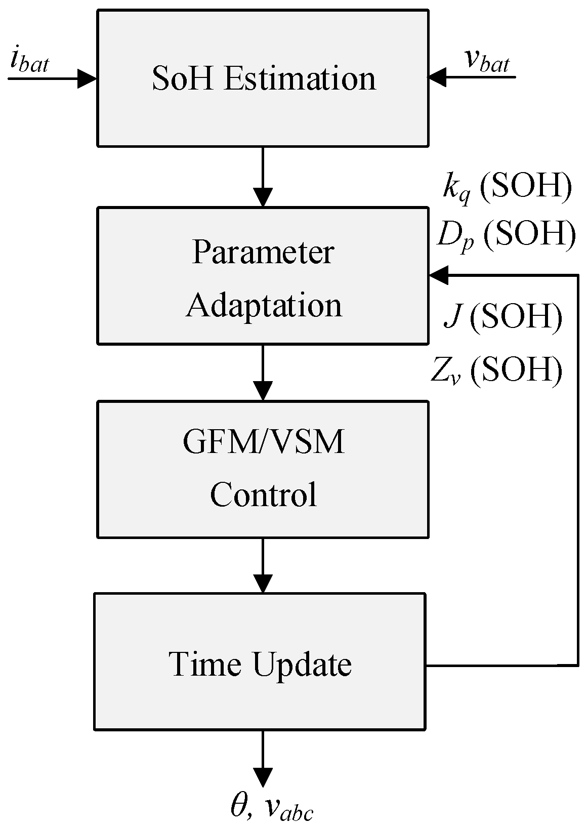 Furthermore, the framework supports multi-modal SoH fusion, which is becoming increasingly important for field-deployed BESS units. For example, combining low-frequency EIS signatures with fast DVA indicators or ML-based trend prediction can enhance robustness against sensor noise and mitigate the uncertainty inherent in individual SoH estimators. The EMS–GFM controller processes only the fused normalized SoH, ensuring that estimation noise does not propagate directly into virtual-parameter adaptation. A smoothing filter and rate-limiting operator are incorporated to reject abrupt estimator fluctuations, preventing excitation of undesirable dynamic responses in the GFM loop.