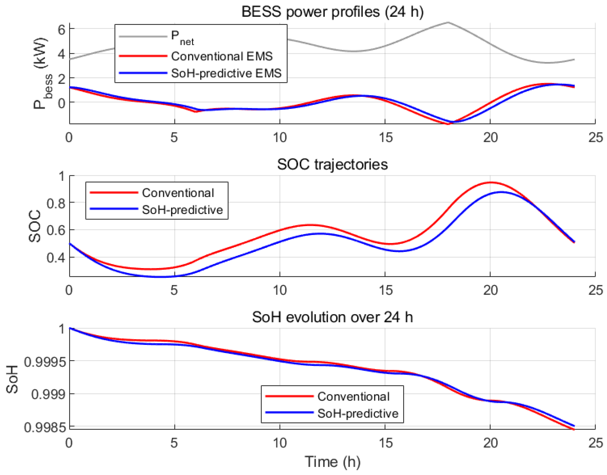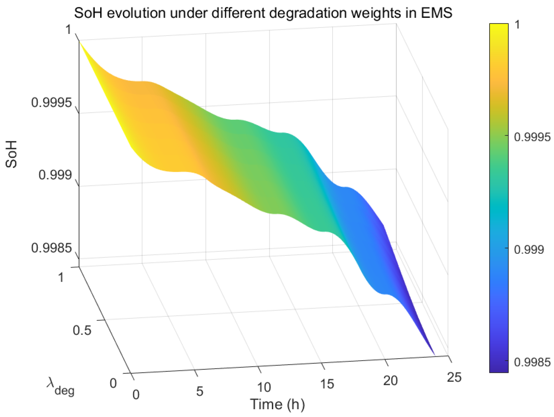 so that the predicted SoH reflects both dynamic cycling stress and long-term storage stress accumulated over time. In this way, is clearly defined as an analytical function of measurable stress factors, rather than an ad-hoc linear term, and remains sufficiently lightweight to be computed online within the EMS while providing a physically meaningful description of degradation evolution. It should be noted that, although the proposed SoH-predictive framework can conceptually be extended to battery packs with multiple parallel strings, the explicit modeling and simulation of SoC balancing among parallel strings are beyond the scope of this work.