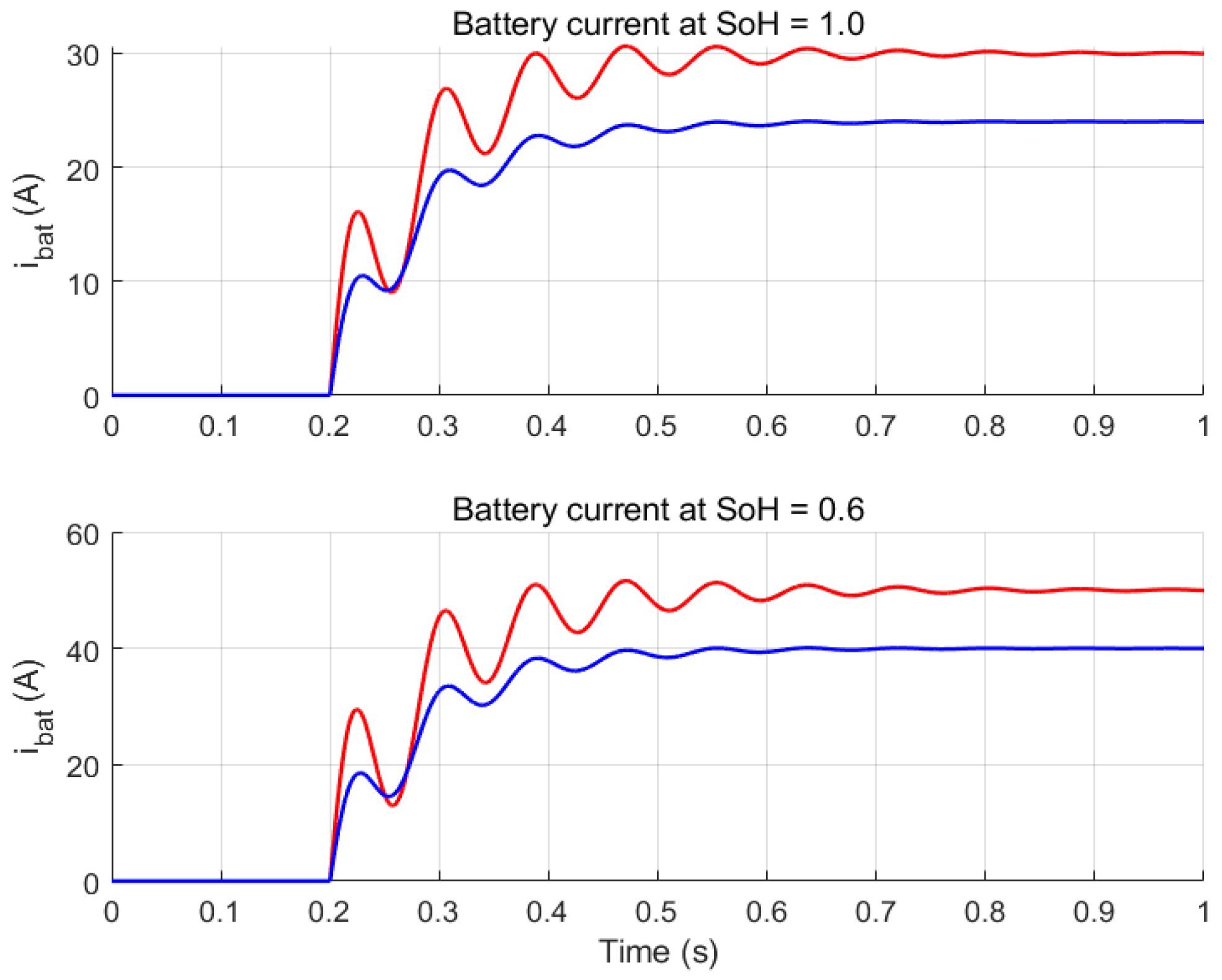 In this work, the internal resistance is explicitly parameterized as a monotonic function of the battery state of health (SoH), given by Rbat(SoH) = R0 [1 + kr (1 − SoH)], where R0 denotes the internal resistance of the fresh battery and kr is an experimentally calibrated degradation coefficient. This formulation provides a control-oriented representation of resistance growth that directly links battery aging to instantaneous voltage drop, power capability reduction, and DC-link stiffness.
