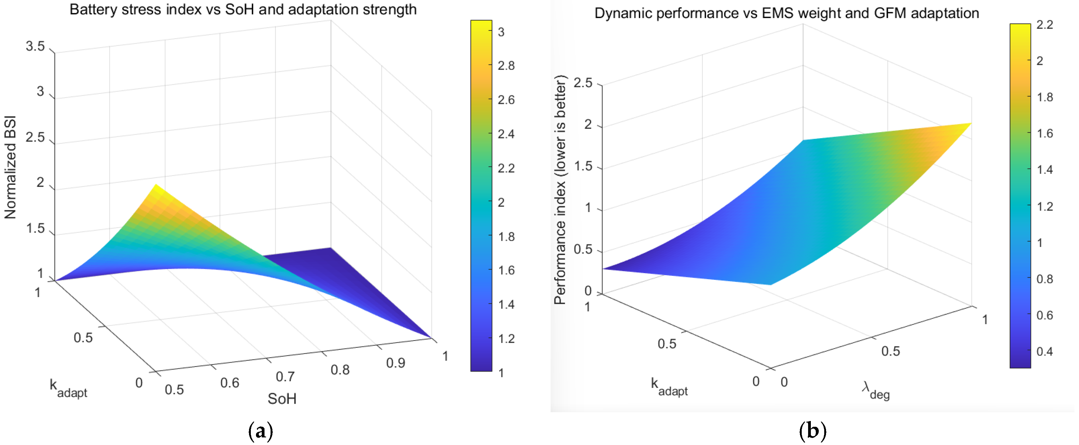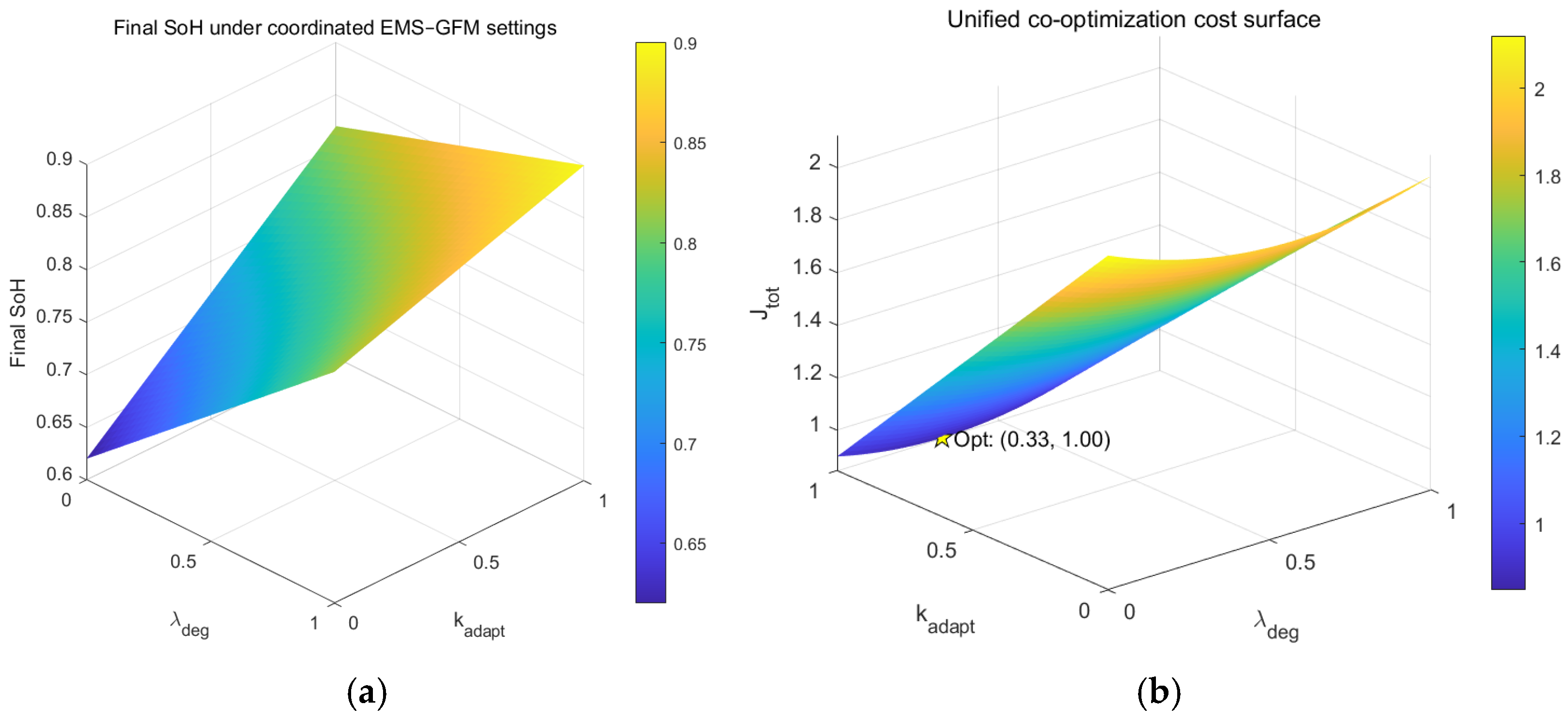 This similarity suggests that many of the mechanisms underlying SoH-aware power control—such as constraints on safe operating regions, degradation-weighted dispatch decisions, and real-time adaptation of converter parameters—can be generalized to fuel cells as well. In both systems, the internal electrochemical processes directly influence the permissible current slew rate, dynamic response capability, and allowable transient power envelope [29,30]. Consequently, the unified EMS–GFM framework proposed in this work may be extended, with appropriate tailoring, to future hybrid energy systems where batteries and fuel cells operate cooperatively in microgrids, transportation platforms, and hydrogen–electric energy hubs.
