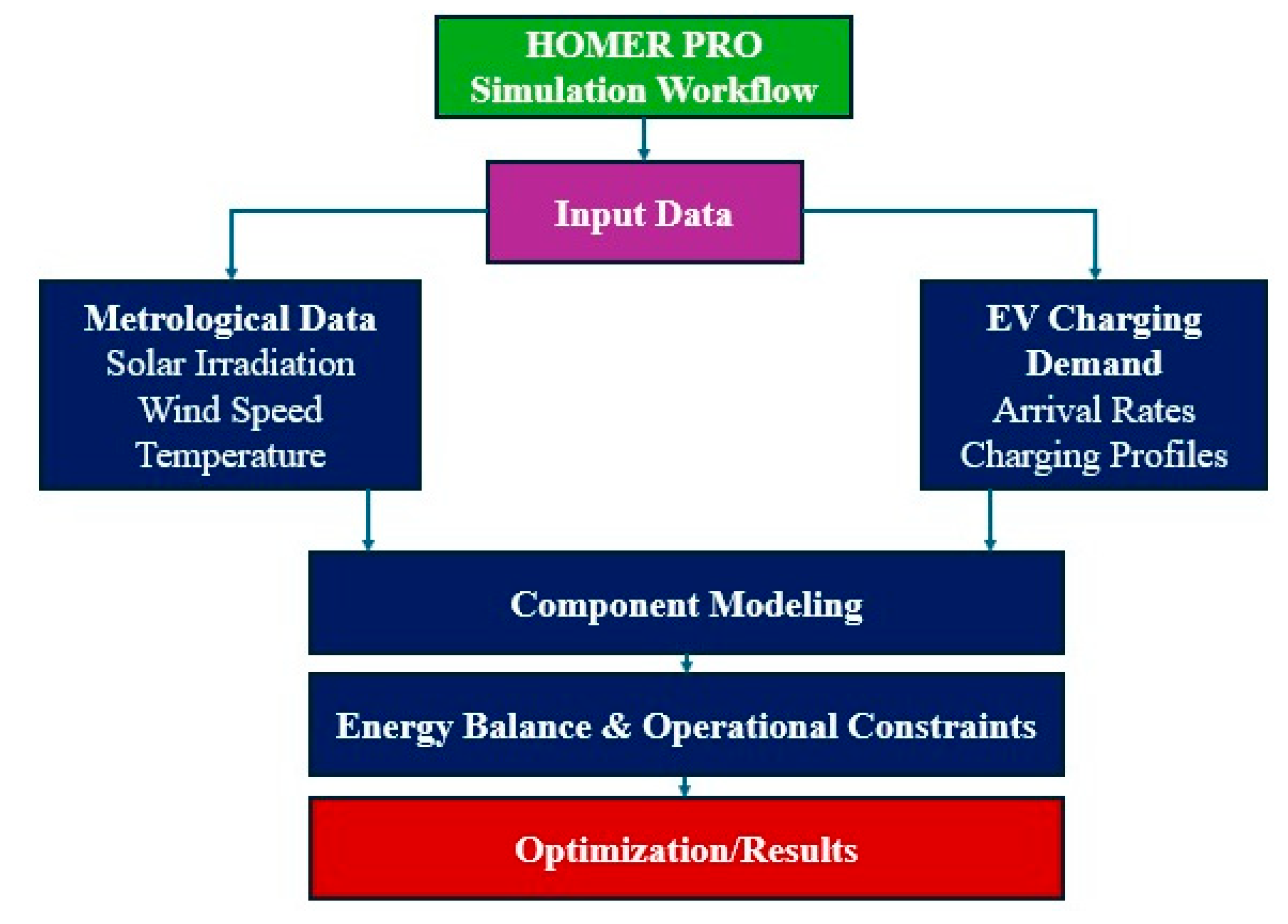 - Simulation Tool Selection: HOMER Pro is used to perform hourly simulations, capturing stochastic variability, battery cycling, hydrogen production, and renewable generation intermittency.