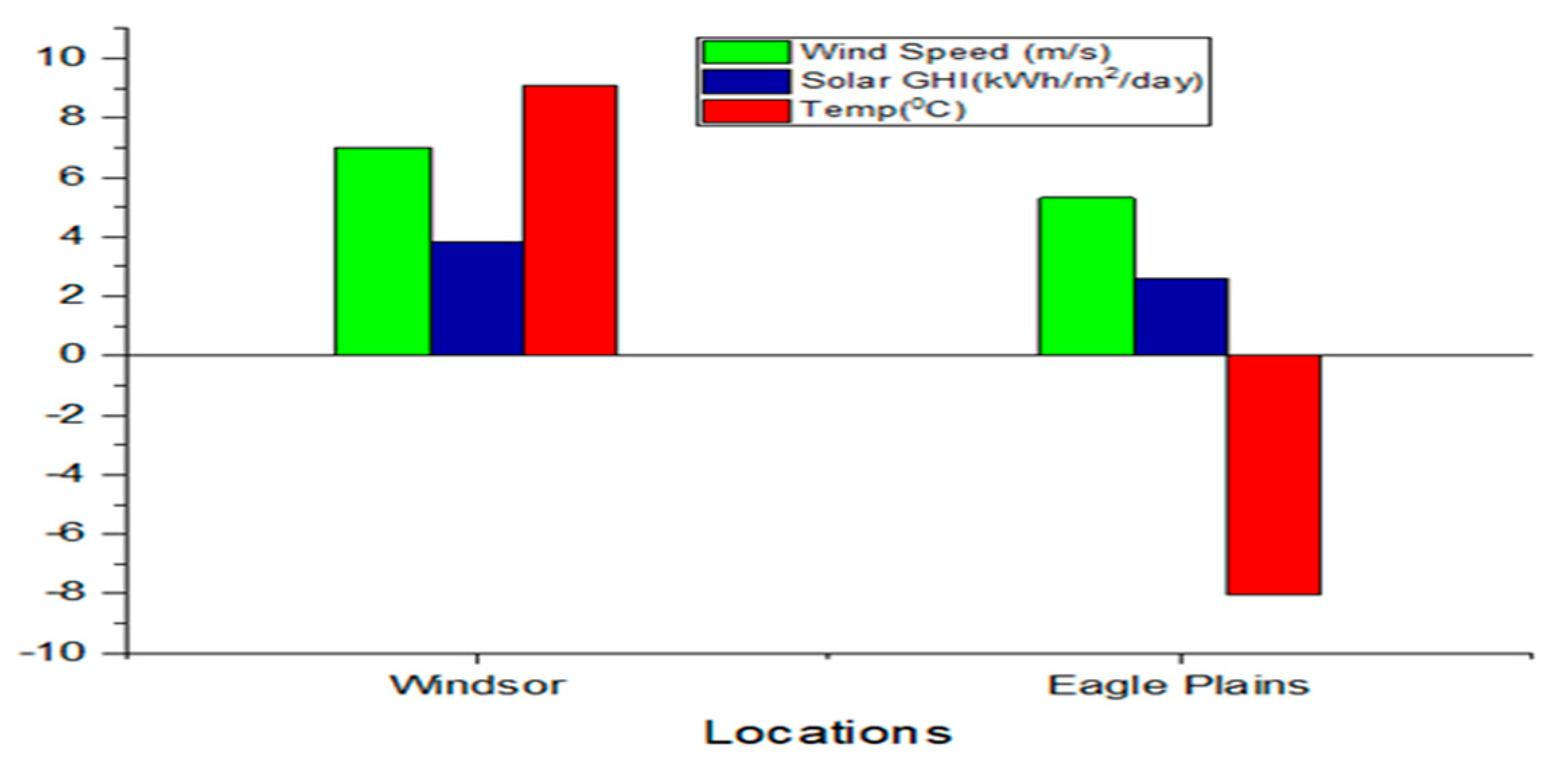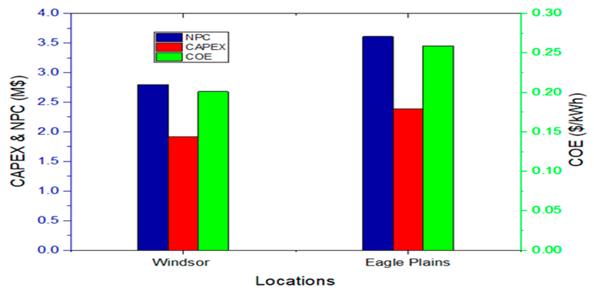 - This study applies location-specific optimization across two diverse Canadian regions to evaluate how regional renewable resource variability and climatic conditions affect system design and economics under a uniform load demand.