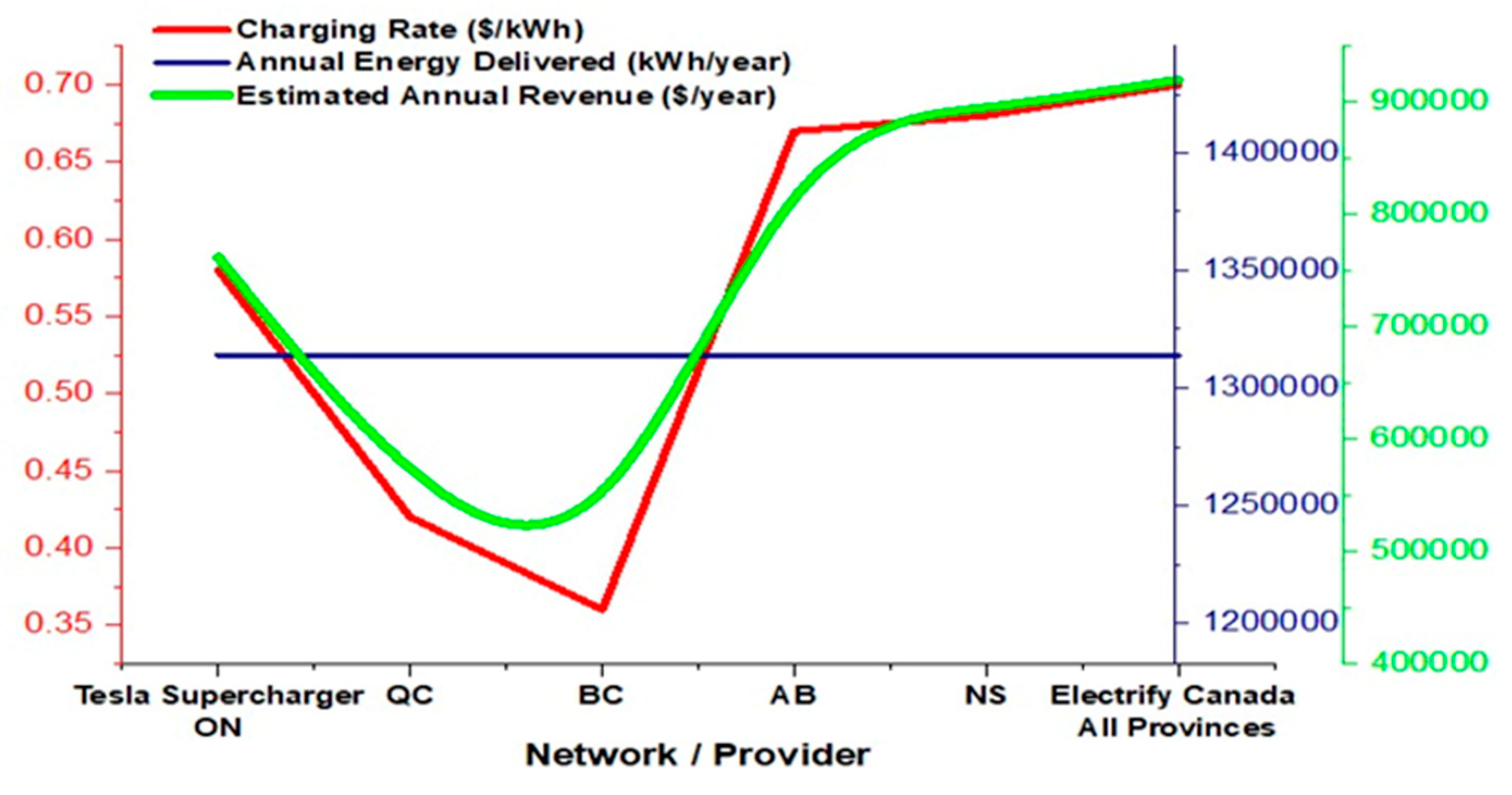- This study provides a region-specific assessment of renewable energy that powers EV fast charging stations in Canada, integrating real networks, energy-based pricing, and estimating annual revenues by offering insights for sustainable and strategically located infrastructure.