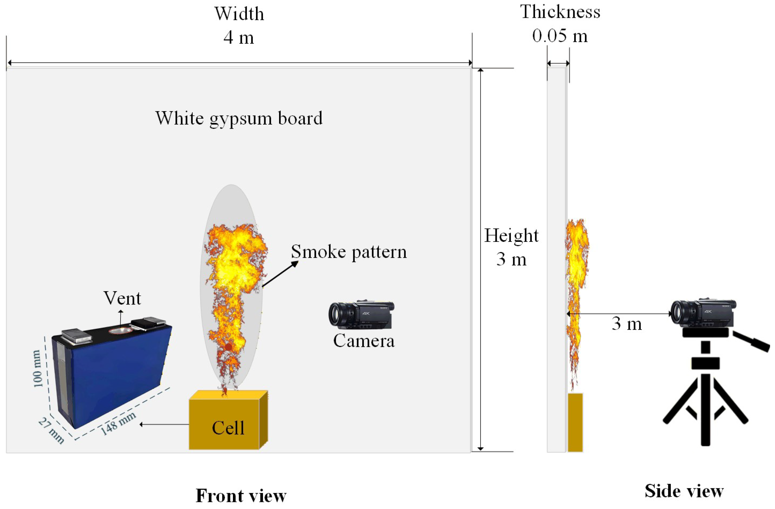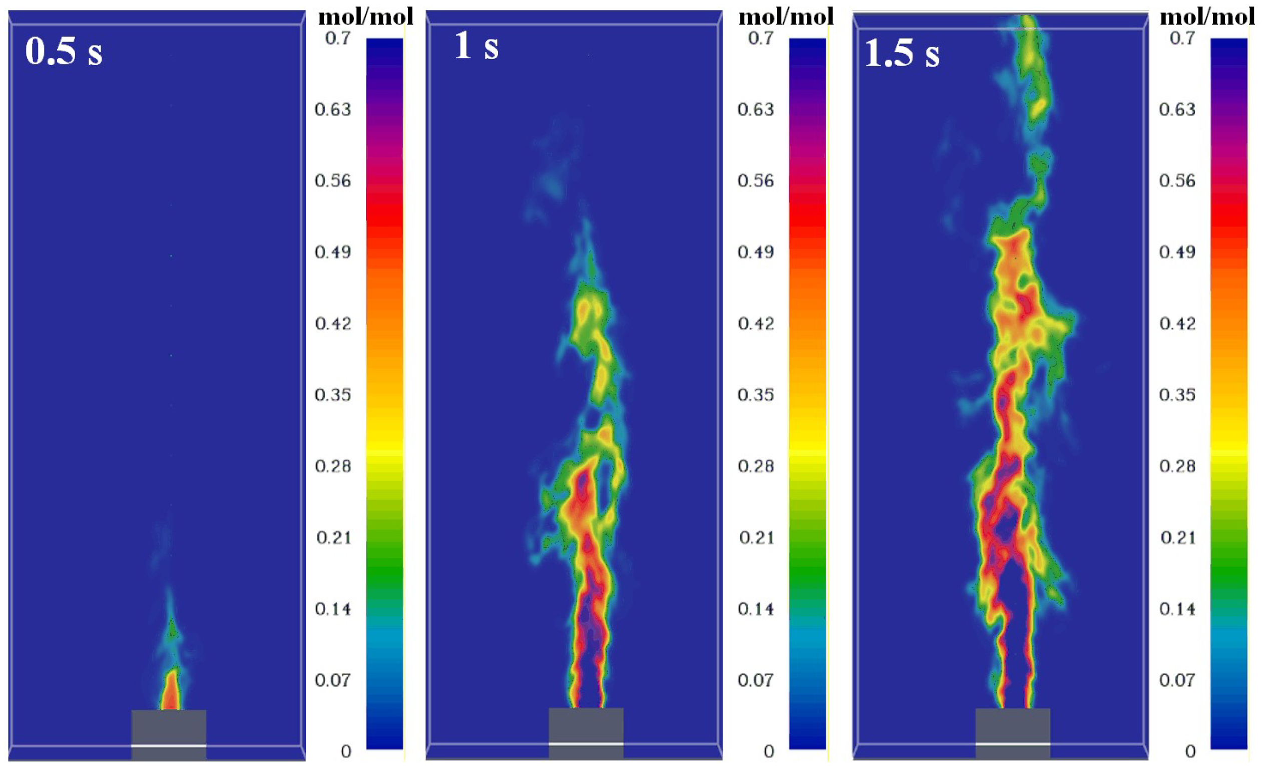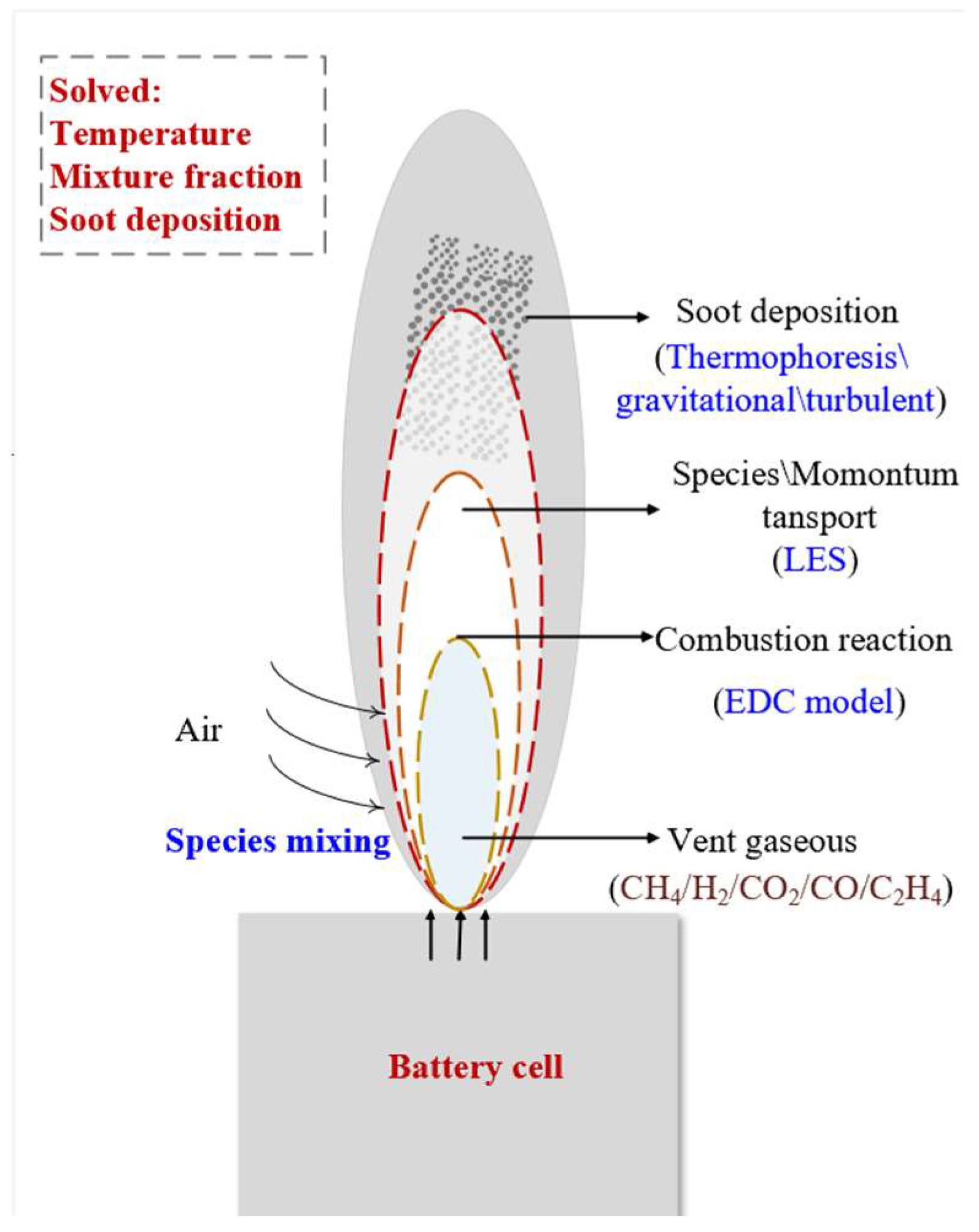 - Flame height modeling: The Delichatsios model effectively predicts the flame height of multi-component LIB jets, with simulations using FDS (Fire Dynamics Simulator) showing strong agreement with experimental data. The model confirms that the boundary velocity between momentum- and buoyancy-dominated regimes is approximately 12 m/s, and the maximum flame height reaches 0.79 m under the tested conditions. This provides a quantitative tool for hazard evaluation.