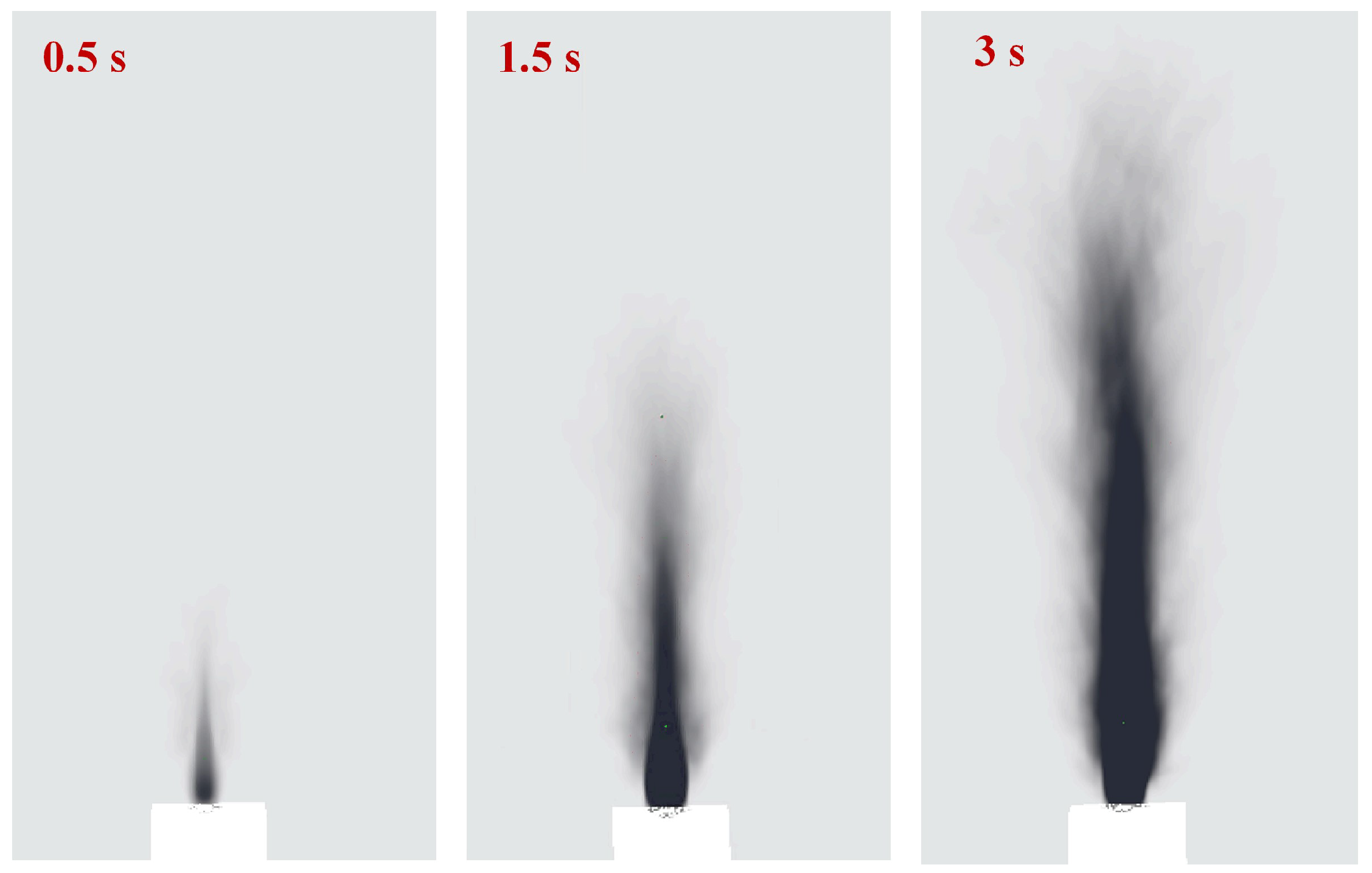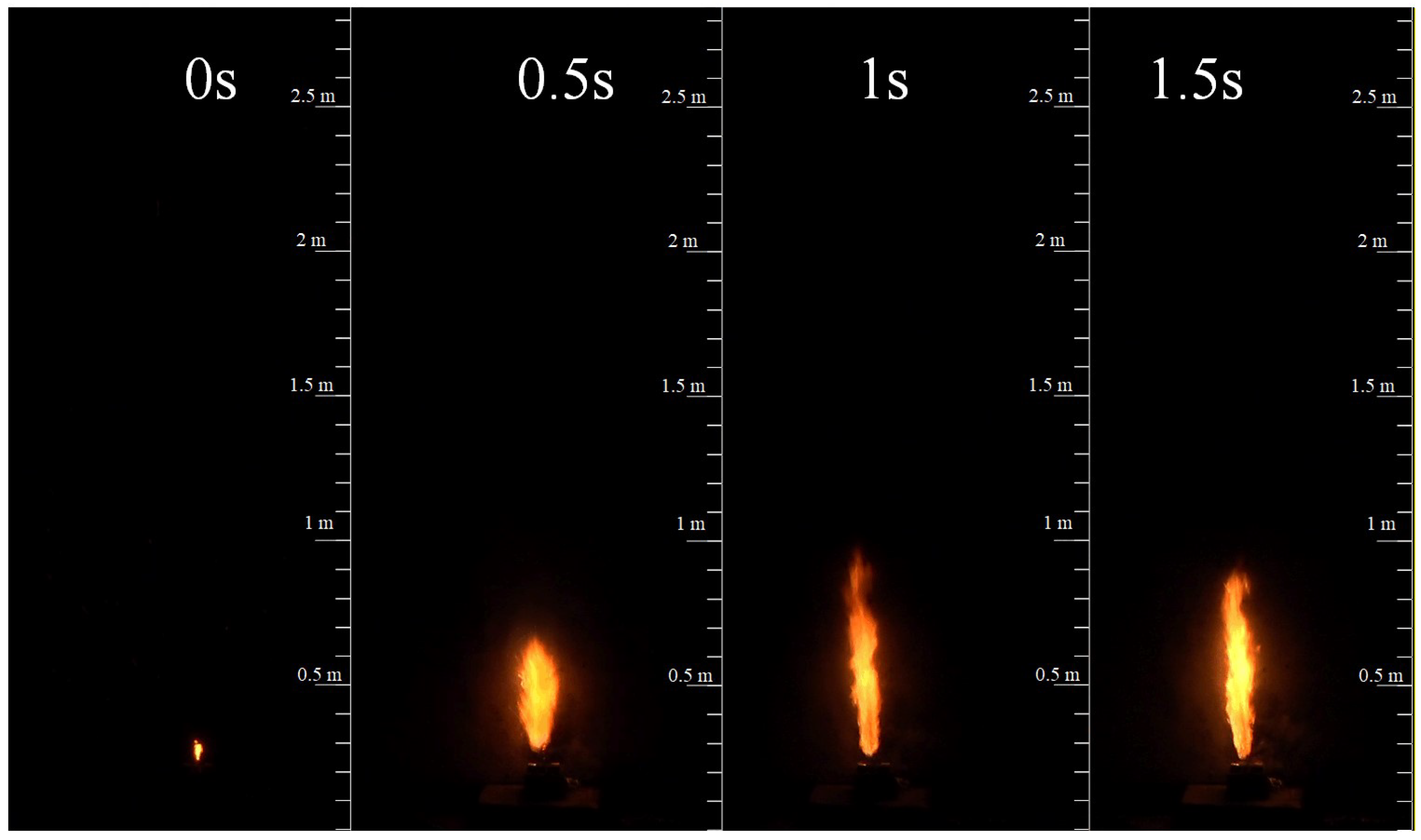 - Dual-regime flame dynamics: The LIB jet flame exhibits two control mechanisms—momentum control and buoyancy control. The initial stage (≤3 s) is dominated by momentum, characterized by high-velocity gas ejection and compact flame structure. Subsequently, buoyancy control prevails, leading to flame expansion and prolonged combustion. This transition is critical for accurately assessing fire development and energy release rates.