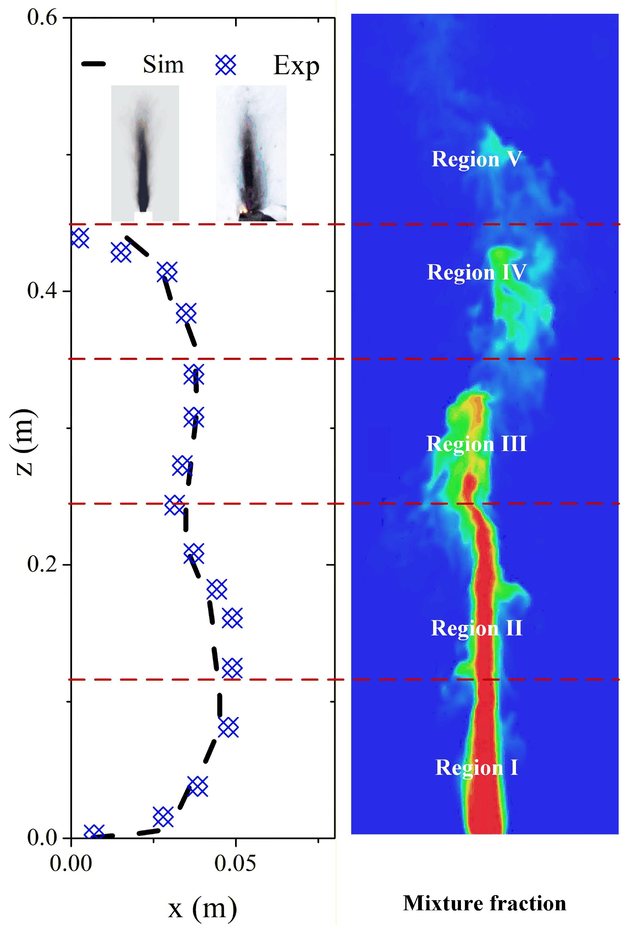 - Smoke pattern mechanisms: Smoke patterns are influenced by the control regime. Momentum control produces intense soot deposition in central zones (Zone I) due to turbulent transport, resulting in dark, parabolic patterns. Buoyancy control generates weaker deposition at flame edges (Zone II), driven by thermophoresis. The overall pattern evolves through four regions, continuous growth, neck, stable, and decay zones, which correlate with flame structure dynamics. A parabolic model (Equation (14)) accurately describes the smoke profile, with coefficients consistent between simulation and experiment.