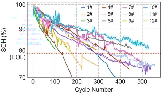 This study defines battery SOH degradation to 80% as reaching EOL. Electric vehicle power batteries typically need to be retired when their State of Health (SOH) drops to around 80%. Grid energy storage systems can tolerate lower thresholds, while high-reliability applications such as drones may require SOH levels above 90%. This threshold comprehensively considers the performance requirements of ternary lithium energy storage batteries in target application scenarios such as residential and commercial energy storage systems, as well as the feasibility of secondary utilization [19]. Based on this EOL criterion and experimental data obtained from 12 cycling conditions, the battery aging curve is plotted as shown in Figure 1. Figure 1 clearly demonstrates the significant impact of different operating conditions on the battery aging pathway. While maintaining consistent charge/discharge rate and DOD, ambient temperature emerges as the key factor driving variations in aging rates. Specifically, batteries exposed to 45 °C high temperatures require significantly fewer cycles to reach EOL SOH degradation compared to those at 25 °C room temperature or −5 °C low temperatures. This indicates that elevated temperatures substantially accelerate irreversible aging processes within the battery. Secondly, DOD also significantly impacts cycle life. Comparing conditions 1–6 at 100% DOD with conditions 7–12 at 50% DOD reveals that, under identical temperature and rate conditions, batteries operating at 50% DOD exhibit longer cycle life and a more gradual aging trajectory.