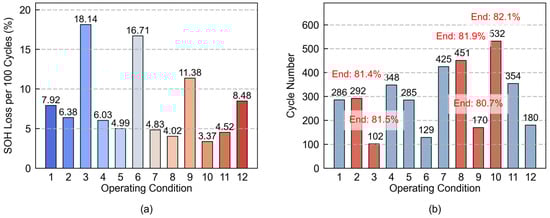 Quantitative diagram of battery aging rate under 12 operating conditions: (a) SOH decay rate of 100 cycles (b) number of cycles in which SOH declines to 80%.
