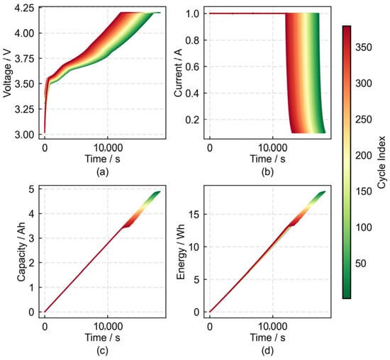 The experiment employed a CC-CV charging method and a CC discharging method. The charging and discharging data from each cycle test were plotted as curves, shown in Figure 3 and Figure 4, respectively. Figure 3 depicts the charging segment: (a) shows the charge voltage-time curve, which gradually shifts upward and to the left with increasing cycle numbers, indicating that the time required for the battery to reach the same voltage threshold progressively shortens; (b) represents the charge current-time curve, exhibiting a leftward shift trend as cycle numbers increase, signifying that the CC phase charging time gradually decreases, allowing the battery to enter the CV charging phase earlier; and (c) and (d) depict the charge capacity and energy variation curves. Both curves shift downward and to the left in the latter half of the cycle. This shift is notably reflected in the mean, variance, and quantiles of the curves. For example, the mean of the curve in Figure 3c decreases from 2.5453 to 1.8143, representing a reduction of 28.72%. Figure 4 depicts the discharge segment. (a) shows the discharge voltage-time curve, which gradually shifts downward and to the left with an increasing cycle count. The voltage plateau exhibits a decreasing trend over cycles, with the battery reaching the discharge cut-off voltage earlier. (b) to (c) depict the capacity and energy curves during discharge. As cycle numbers increase, the curve trends resemble those in the charging phase. For instance, the average curve value in Figure 4b decreased from 2.4395 to 1.7244, representing a 29.31% reduction.