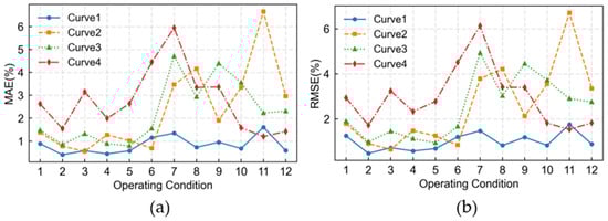 Error curves for four methods under various operating conditions: (a) represents the MAE curve; (b) represents the RMSE curve.