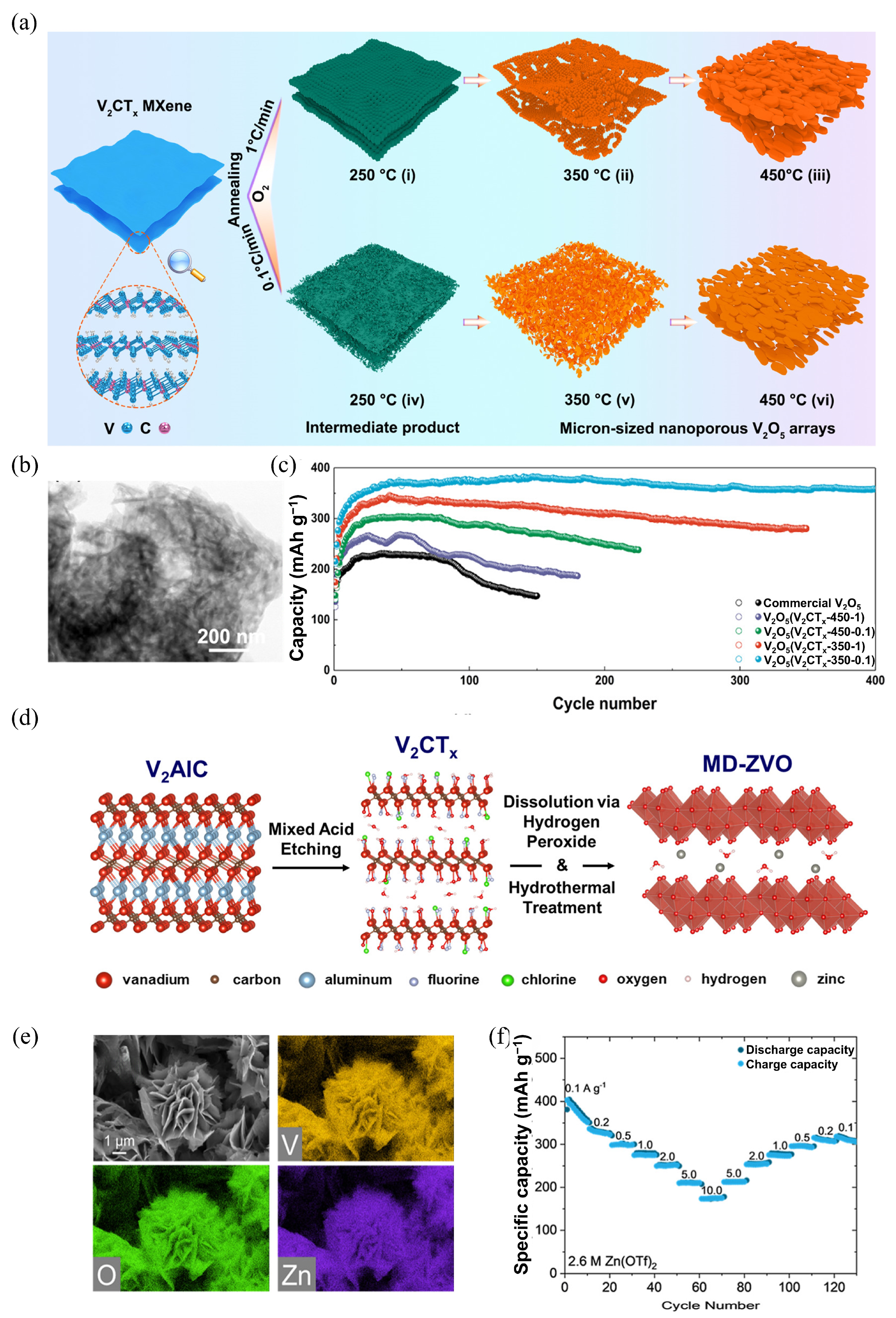 - Averianov, T.; Matthews, K.; Zhang, X.; Nguyen, H.T.K.; Zhang, Y.; Gogotsi, Y.; Pomerantseva, E. Operation of MXene-Derived Zinc-Preintercalated Bilayered Vanadium Oxide Cathode in Aqueous Zn-Ion Batteries. ACS Appl. Energy Mater. 2025, 8, 12695–12711. [Google Scholar] [CrossRef] [PubMed]