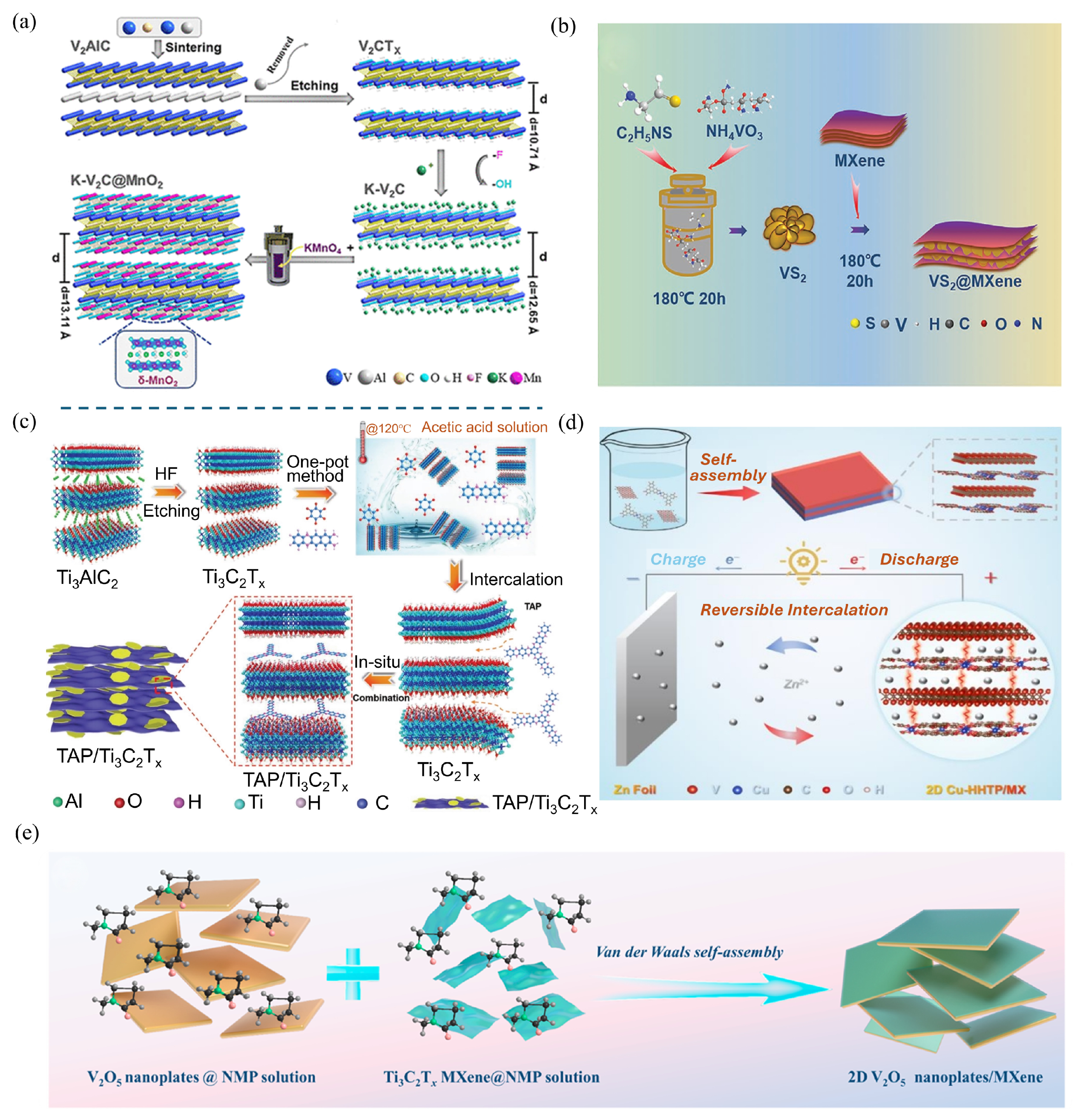- Liu, H.; Jiang, L.; Cao, B.; Du, H.; Lu, H.; Ma, Y.; Wang, H.; Guo, H.; Huang, Q.; Xu, B.; et al. Van der Waals Interaction-Driven Self-Assembly of V2O5 Nanoplates and MXene for High-Performing Zinc-Ion Batteries by Suppressing Vanadium Dissolution. ACS Nano 2022, 16, 14539–14548. [Google Scholar] [CrossRef]