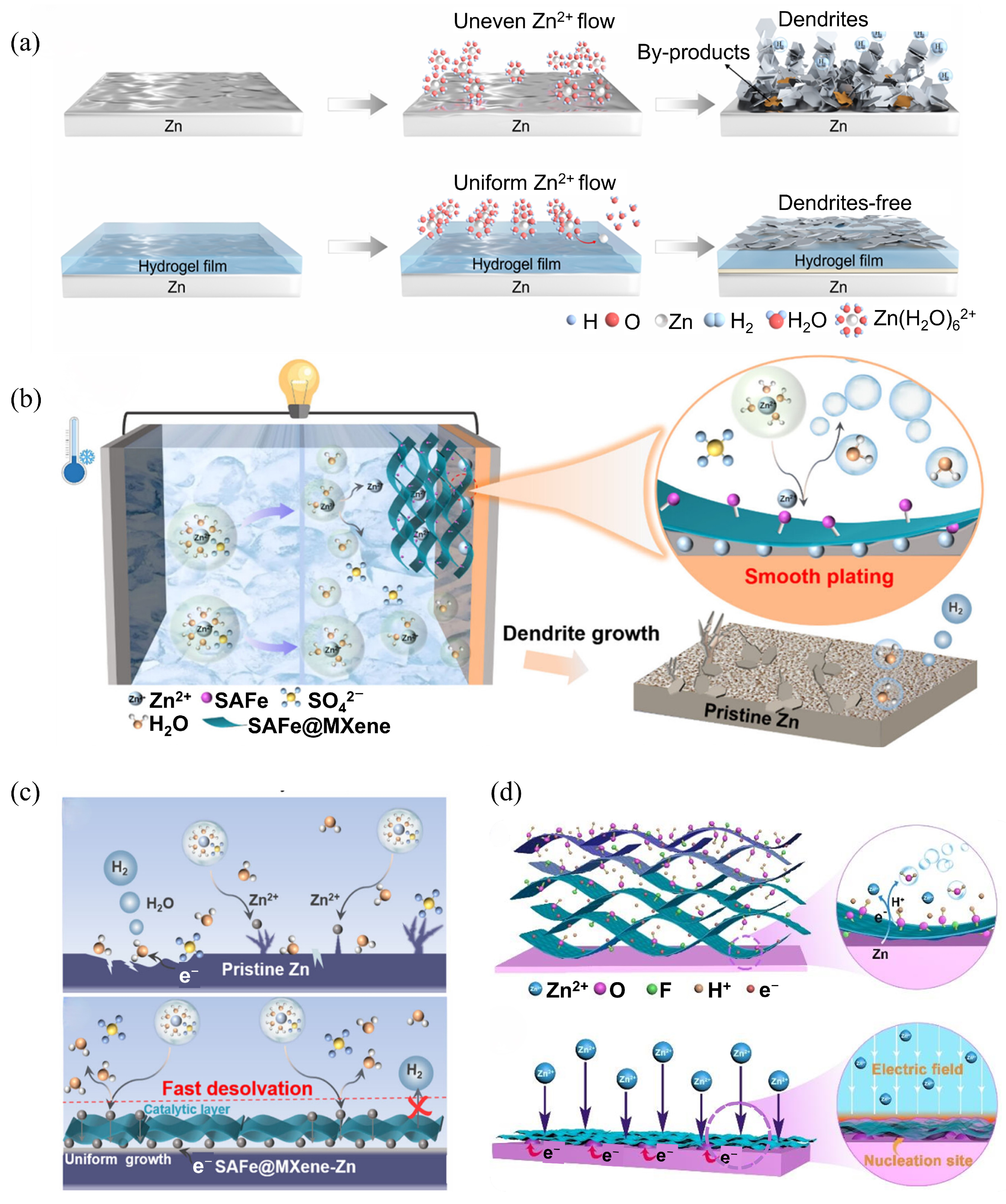 - Zhang, J.; Pan, L.; Jia, L.; Dong, J.; You, C.; Han, C.; Tian, N.; Cheng, X.; Tang, B.; Guan, Q.; et al. Delocalized Electron Engineering of MXene-Immobilized Atomic Catalysts toward Fast Desolvation and Dendritic Inhibition for Low-Temperature Zn Metal Batteries. Nano Lett. 2025, 25, 3756–3765. [Google Scholar] [CrossRef]