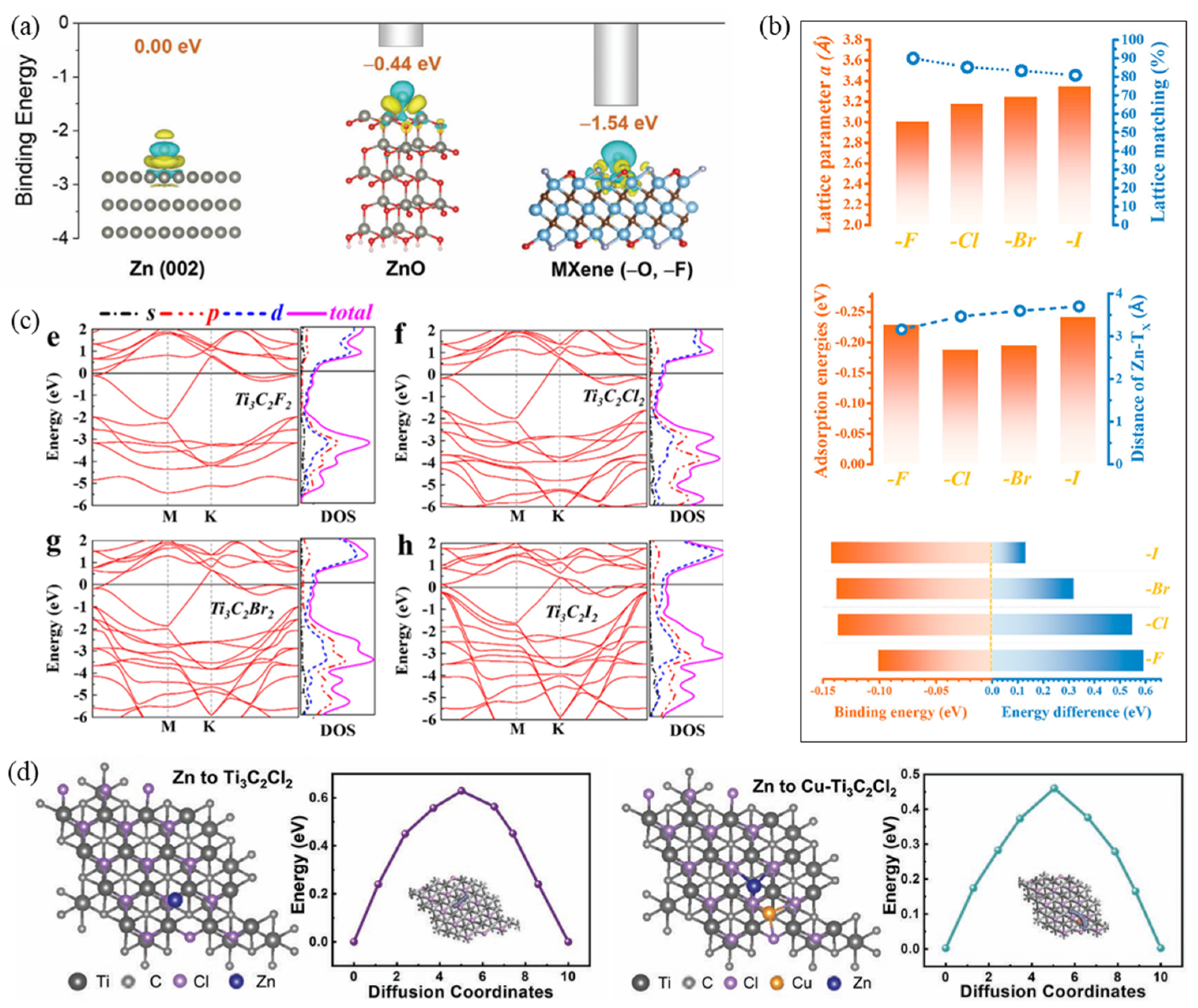 - Li, X.; Li, M.; Luo, K.; Hou, Y.; Li, P.; Yang, Q.; Huang, Z.; Liang, G.; Chen, Z.; Du, S. Lattice matching and halogen regulation for synergistically induced uniform zinc electrodeposition by halogenated Ti3C2 MXenes. ACS Nano 2021, 16, 813–822. [Google Scholar] [CrossRef]