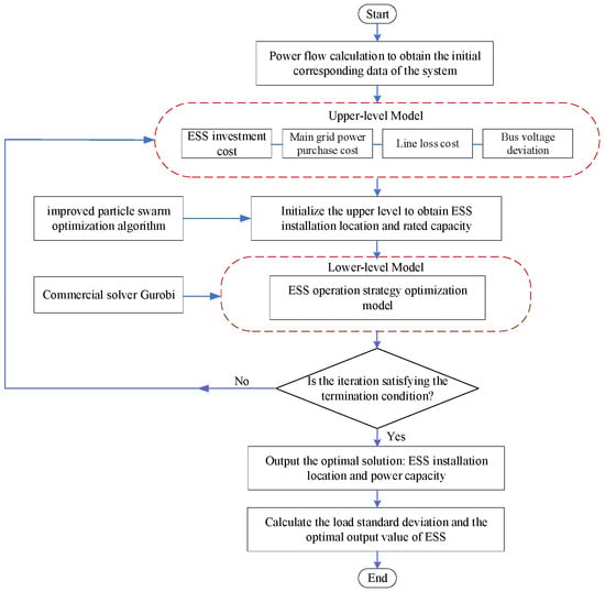 Figure 3 shows a bi-level optimal configuration method for the ESS in AC/DC hybrid distribution networks, split into upper planning and lower operation levels. The upper level, with minimum comprehensive cost as the objective, uses an improved particle swarm optimization algorithm to initialize ESS location and capacity. The lower level, targeting minimum load standard deviation, adopts the commercial solver Gurobi for accurate optimization to determine system operating parameters and costs. The upper and lower levels realize collaborative optimization through a feedback mechanism: the lower level feeds back operating parameters to update the upper-level plan, while the upper-level ESS configuration serves as the lower-level input to form a complete model. This method realizes the integrated optimal configuration of location, capacity, and operation control of the ESS in the distribution network, taking into account economy, operational efficiency, and system feasibility.