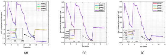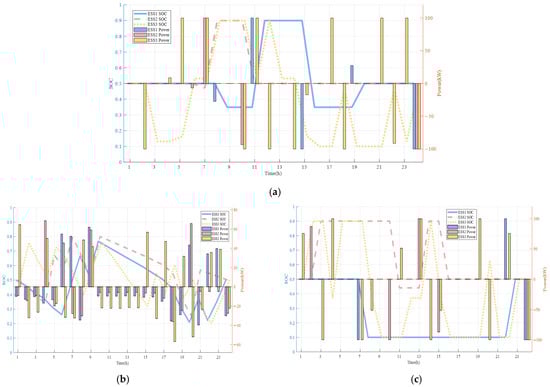 Scenario 1 is the optimal configuration scenario. Although the power purchase cost of the main network is the lowest among the four scenarios, the voltage deviation cost is significantly higher than that of other scenarios, and the final total cost is the lowest among the four scenarios, which is suitable for the scenario where the voltage stability requirement is relatively low and the total cost is given priority in control. Scenario 2 maintains the same location but adjusts the capacity. The increase in ESS capacity greatly reduces the cost of voltage deviation, but also increases the cost of power purchase in the main network, which reflects the characteristics of increasing capacity to improve voltage quality but increasing power purchase expenditure. Scenario 3 switches to different locations and keeps the capacity unchanged. The investment cost is the highest in the four scenarios, the cost of no overvoltage deviation is reduced, and the line loss cost is also maintained at a low level. Scenario 4 adjusts the location and capacity at the same time, and the investment cost is minimized, but the main network purchase cost becomes the highest among the four scenarios, and the total cost also increases.