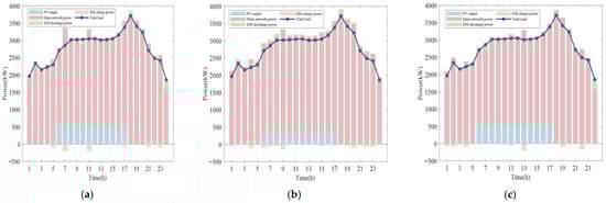 Section 3.3 focuses on analyzing and comparing the bus voltage conditions of AC/DC hybrid distribution networks under different control modes. Figure 4 presents the load curve of the AC/DC hybrid distribution network. During the 00:00–18:00 period, the original total load exhibits an overall upward trend, reaching a peak load of 3715 kW at 18:00; in contrast, the total load fluctuation becomes more significant after the integration of PV and ESS, while the load level generally remains lower than the original load. After 18:00, both load curves decrease rapidly: the original load drops to 1858 kW, and the load with PV and ESS integration decreases to 1557 kW. On the whole, this figure clearly illustrates the changes in the fluctuation characteristics of the total load power induced by the integration of PV and the ESS, and effectively verifies that PV and ESS integration reduces the overall power level of the total load.