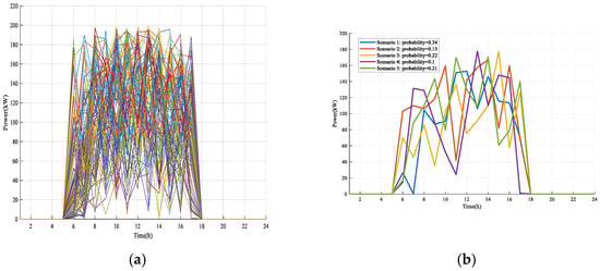 In the configuration of the ESS, the diversity of PV operating scenarios is taken into account to maximize the ESS’s operational benefits while minimizing resource waste, thereby ensuring that the power system can maintain real-time dynamic stability under each scenario. However, incorporating all PV operating scenarios over several years would lead to excessive computational complexity, and redundant solutions are prone to arising due to scenario similarity. Therefore, this paper employs the synchronous backward substitution method to reduce the historical actual output data of PV over several years. Each day of PV operation corresponds to one scenario, and a set of typical PV output scenarios is derived accordingly. The occurrence probability of each typical scenario is calculated as follows: