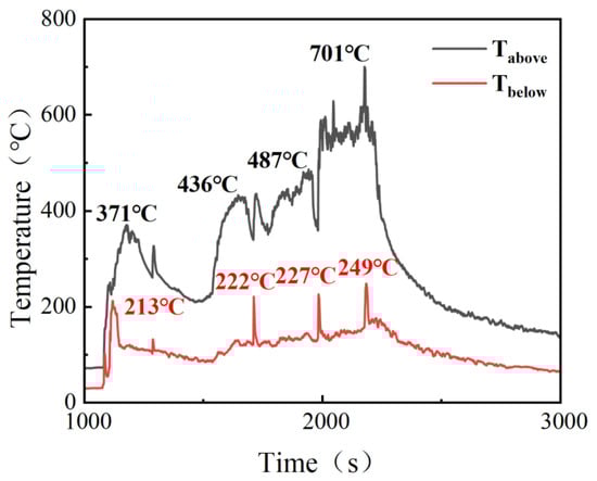 Figure 4 presents the variations in cell voltage and surface temperature during the test, and Figure 5 shows the evolution of the gas temperature inside the experimental module. Before the start of the experiment, all cells were at 27 °C. As heating proceeded, the safety valve of cell 1# opened at 1074 s, at which time the temperature was 171 °C; TR occurred at 1122 s, with a corresponding temperature of 193 °C; the peak temperature was reached at 1228 s, reaching 368 °C. For cell 2#, the safety valve opened at 1284 s at a temperature of 176 °C; full TR occurred at 1550 s, when the temperature reached 202 °C; the peak temperature appeared at 1700 s and reached 421 °C. For cell 3#, the time and temperature corresponding to safety-valve activation were 1708 s and 184 °C, respectively; TR occurred at 1794 s with a temperature of 208 °C; the peak temperature appeared at 2186 s and reached 469 °C. For cell 4#, the times for safety-valve activation, onset of TR, and peak temperature were 1980 s, 2016 s, and 2218 s, respectively, with corresponding temperatures of 189 °C, 210 °C, and 472 °C. In Figure 5, four distinct temperature-rise stages can be observed, corresponding exactly to the TR processes of the four cells. When the first cell underwent TR, the maximum temperatures in the upper and lower spaces were 371 °C and 213 °C, respectively; when the second cell underwent TR, the maximum upper and lower space temperatures were 436 °C and 222 °C, respectively; when the third cell underwent TR, these temperatures increased to 487 °C and 227 °C; and when the fourth cell underwent TR, the maximum upper and lower space temperatures further increased to 701 °C and 249 °C, respectively. With the gradual increase in temperature inside the box and the continuous flame impingement on the cells, the safety-valve activation temperature, the initial TR temperature, the peak TR temperature of each cell, as well as the gas temperature in each stage, all exhibited continuous increases. A similar trend was observed for the temperatures on the rear surfaces of the cells: the maximum rear-surface temperatures of cells 1#, 2#, and 3# all remained above 400 °C. For cell 4#, the rear-surface temperature was relatively lower because it was in direct contact with a steel clamp with high thermal conductivity, but still exceeded 360 °C. Therefore, it can be concluded that the persistent high-temperature field and sustained flame impingement not only elevated the overall temperature of the cells, greatly increasing the risk of TR, but also raised the bulk gas temperature inside the box, thereby posing a serious threat to the safety of the remaining cells.