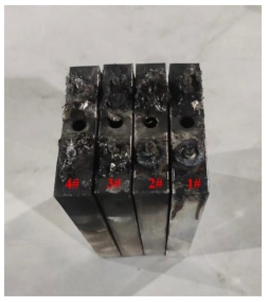 As shown in Table 3, the mass losses of cells 1#, 2#, 3#, and 4# between before and after the experiment were 20.7%, 20.3%, 20.1%, and 19.8%, respectively, all of which are greater than the 19.3% mass loss observed for a single cell undergoing TR, indicating that the reaction of the battery module was more intense and the cell damage was more severe [25]. As shown in Figure 6, the upper surfaces of the cells are covered with residues from material combustion and exhibit a dark brown color, which indirectly reflects the severity of the flame burning during the test.