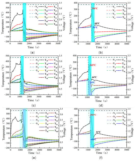 Changes in cell voltage and surface temperature during the testing process: (a,b) Test 3, (c,d) Test 4, (e,f) Test 5.