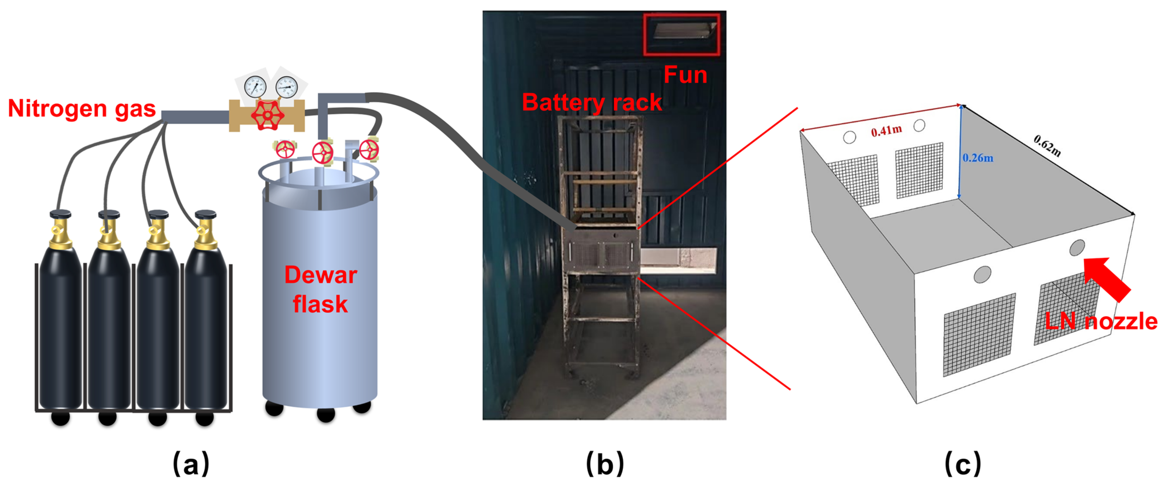7]. With the rapid development of energy-storage stations toward larger scale and higher energy density, the consequences of fire incidents have become increasingly severe. For example, a fire occurred at the Gateway energy-storage station in California, USA, on 15 May 2024, and persisted for nearly two weeks with multiple re-ignitions. Therefore, it is of critical importance to develop fire-suppression strategies capable of rapidly and effectively mitigating TR.