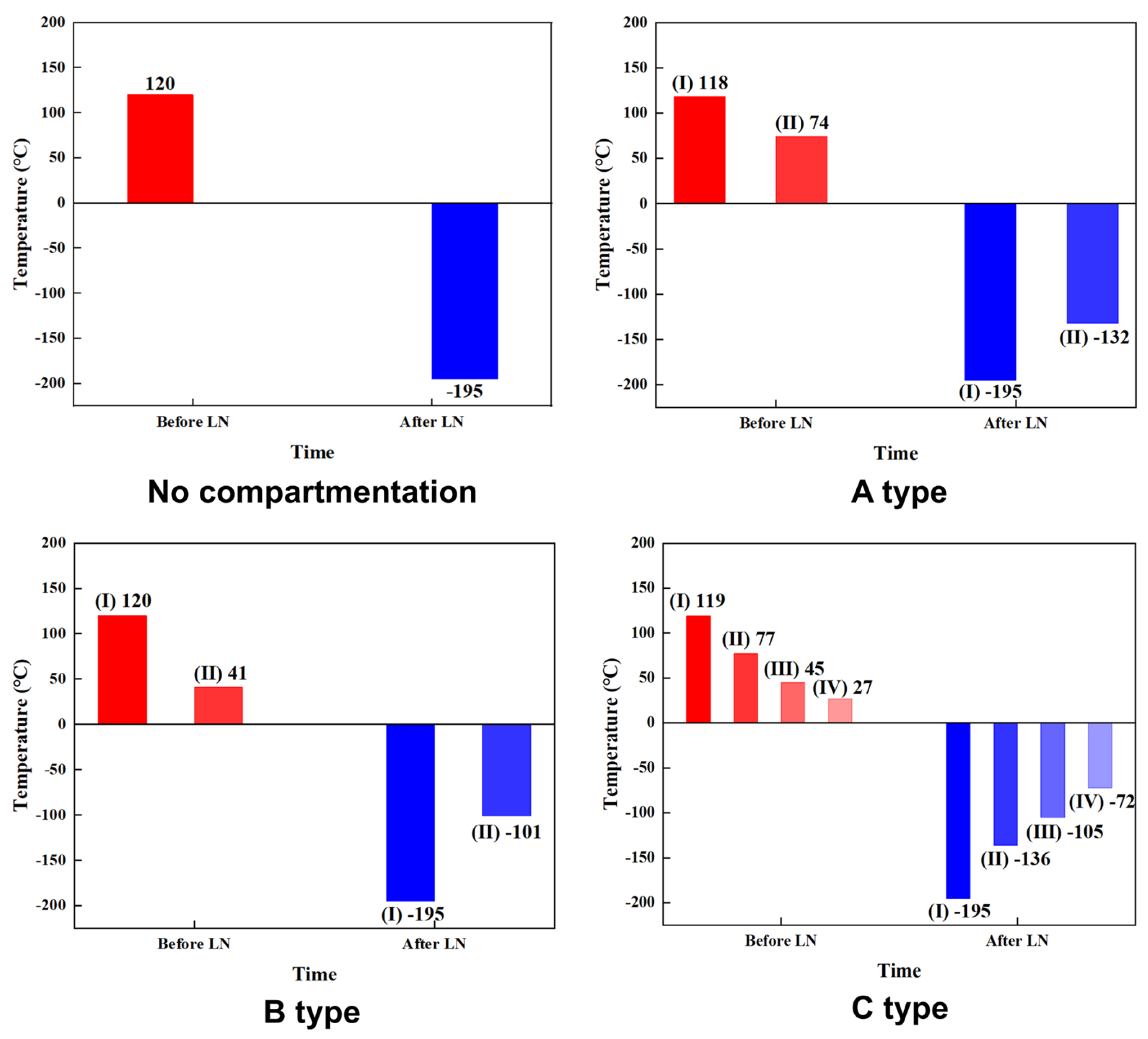 This study examined the impact of three different fire compartment configurations on the suppression of TRP in large-capacity LIB modules. A method to enhance LN fire suppression effectiveness based on fire compartmentalization was proposed. Future research could explore more types of compartment design methods, as this enhanced design could improve LN fire suppression performance in engineering applications. Moreover, future research will extend the application of this LN suppression strategy to higher energy-density systems, such as high-nickel layered cathodes and lithium metal anodes, to evaluate the method’s efficacy under more aggressive thermal runaway conditions. In addition, future investigations will explore the suppression performance of LN under dynamic operating conditions, including high C-rate charging and active discharge cycles, to assess the system’s effectiveness under varying internal thermal stress levels.