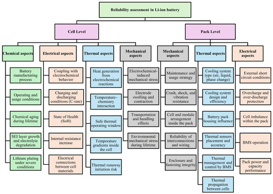 Reliability assessment framework for Li-IBs at the cell and pack levels.