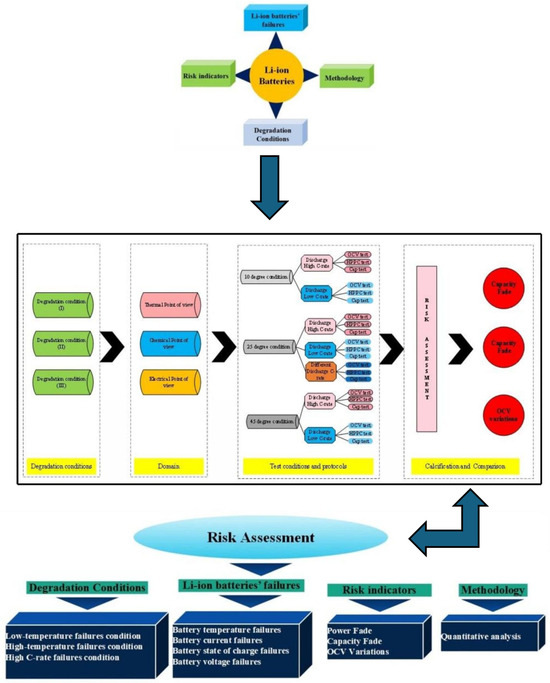 This work proposes a qualitative risk analysis framework for evaluating risk in NMC Li-IBs. The assessment is conducted over the battery’s lifetime under different degradation conditions and is based on a set of pre-defined risk indicators. Commercial cylindrical lithium-ion cells (INR18650 HG2, 3000 mAh, nominal voltage 3.6 V, NMC chemistry) manufactured by LG Chem (Seoul, Republic of Korea) were used in this study. The overall workflow of the risk analysis methodology for NMC Li-IBs is depicted in Figure 2 [30]. In this study, the standard charge/discharge test protocol (TPC) refers to constant-current charging to an upper cut-off voltage of 4.2 V followed by constant-current discharge to a lower cut-off voltage of 2.4 V, with a 30 min rest period between charge and discharge steps; each step is terminated upon reaching the specified voltage limit. Three main degradation conditions are considered within the proposed risk analysis: