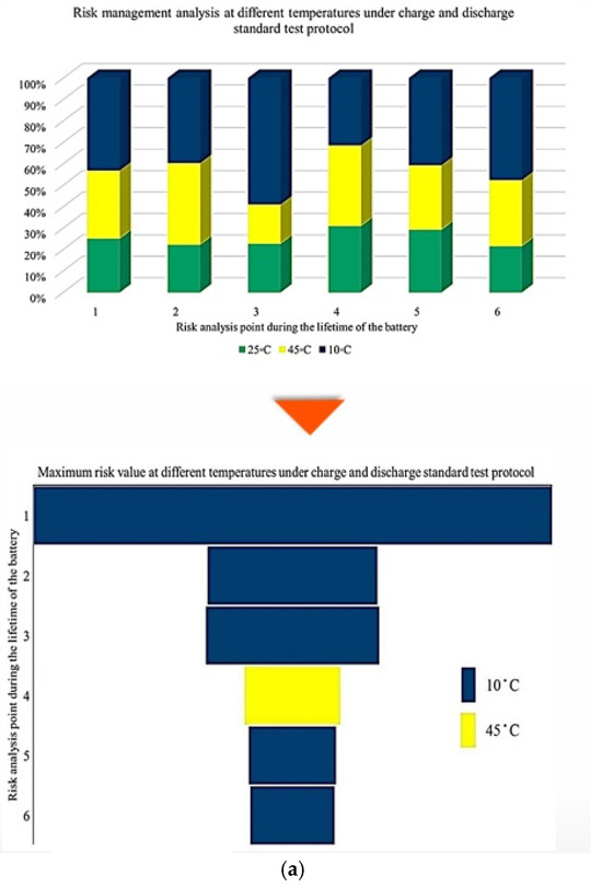 For example, at the first risk point, the highest risk contribution is associated with operation at 10 °C. Examination of the overall trend reveals that low temperatures (10 °C) contribute the most to maximum risk at most stages, followed by high temperatures (45 °C). This confirms that both low and high thermal stresses play a key role in accelerating capacity degradation over the lifetime of NMC Li-IBs. Another aspect of the risk analysis concerns the frequency with which each degradation condition contributes to the maximum risk across all risk points, and this is evaluated by counting the number of occurrences in which a specific condition exhibits the highest contribution to CF. The probability distribution of maximum risk contributions under different temperatures, expressed as percentages, is depicted in Figure 5.