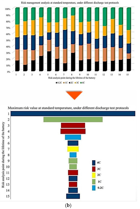In this representation, the length of each bar corresponds to the relative contribution of a given degradation condition to the overall maximum risk. The results demonstrate that the highest probability of maximum CF risk occurs at 10 °C, and that battery operation at 25 °C under standard charge/discharge conditions exhibits a lower risk over time. This means that moderate temperature operation provides improved reliability, while operation at low temperature leads to a higher level of degradation. The analysis further confirms that battery operation at 25 °C and 10 °C represents relatively more and less reliable conditions, respectively, when evaluated from a long-term CF standpoint. Also, CF is analyzed under standard temperature conditions with varying discharge C-rates. The results show that the maximum contribution of CF over battery lifetime occurs at different risk points for different discharge rates, in which CF contributions of approximately 40% at the fifth point for C/5, 20% at the second point for 1 C, 10% at the tenth point for 2 C, 25% at the seventh point for 3 C, and 35% at the tenth point for 4 C are noted. In this case, 15 risk points are considered, corresponding to 5 discharge-rate scenarios. The trend suggests that higher discharge currents lead to increased risk levels, due to elevated Rint and enhanced heat generation. For the 4 C condition, a high risk of power and capacity loss is observed during early cycling, then followed by fluctuations through battery life, and culminating in the highest risk at the end of life, and the C/5 condition also exhibits the most stable behavior, with minimal volatility across the battery lifetime. Despite its stability, the sustained operation at C/5 can still contribute significantly to degradation over long periods, highlighting that low discharge rates alone do not guarantee minimal risk. Thermal effects and cumulative heat generation must also be considered. It should be noted that, in this study, stability is defined as the overall consistency of degradation behavior evaluated using the combined evolution of CF, internal resistance, and OCV-based indicators, rather than the minimum variation in a single degradation metric. Accordingly, localized fluctuations observed in individual indicators do not contradict a condition being classified as stable when no systematic or accelerating degradation trend is identified across the combined indicators. The probability analysis further shows that the highest risk contribution under standard temperature conditions occurs for the 4 C discharge rate during early battery life. High discharge currents accelerate structural degradation of electrode materials and promote deformation of lithium storage networks. Additionally, early-cycle degradation behavior observed at high discharge rates may be associated with degradation phenomena commonly linked to SEI evolution, as reported in the literature, while localized heating and mechanical stress under high current conditions are known to exacerbate degradation. High discharge currents are known to impose increased electrochemical and mechanical stress on electrode materials, which can accelerate degradation processes reported in the literature. In this study, early-cycle degradation trends observed under high C-rate operation may be associated with degradation phenomena commonly linked to SEI-related effects, as well as increased interfacial stress arising from localized heating and mechanical loading, as widely discussed in previous studies. Figure 5 further illustrates CF behavior under combined temperature and discharge-rate conditions, showing that the highest CF contributions over battery lifetime occur for operating scenarios involving low temperature and high discharge current, particularly at 10 °C with high C-rate operation. From a qualitative perspective, such operating conditions are consistent with advanced degradation pathways reported in the literature, including lithium plating at the anode, SEI-related degradation, and structural disordering of electrode materials. In contrast, when evaluated from a multi-indicator perspective, the 25 °C/4 C condition exhibits comparatively stable behavior after the initial cycling stages, despite localized variations in individual CF-related risk contributions.